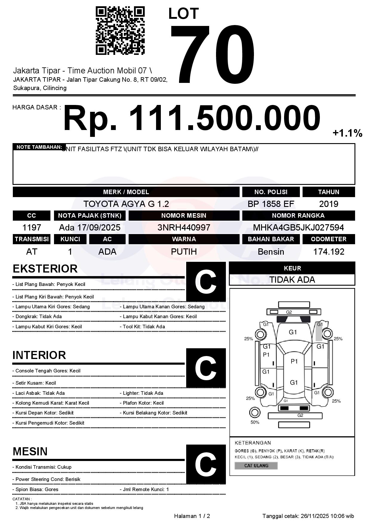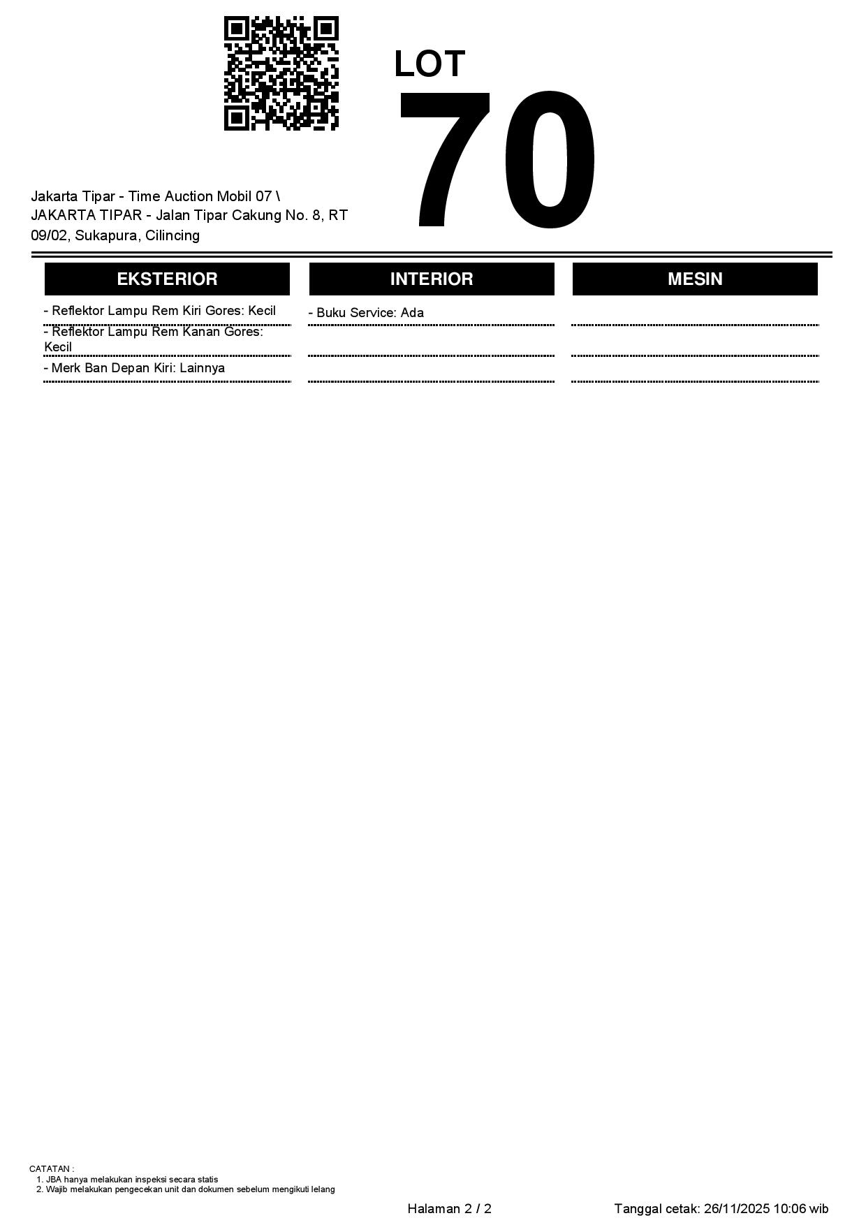 - Kondisi objek lelang dilelang apa adanya, baik kondisi fisik, mesin maupun legalitas kendaraan. Jika terdapat kekurangan/cacat baik yang terlihat maupun yang tidak terlihat, maka semua akan menjadi tanggung jawab/risiko Pemenang Lelang. Oleh karena itu, Pemenang Lelang melepaskan segala hak untuk menuntut dan/atau meminta ganti rugi atas hal tersebut kepada JBA.
