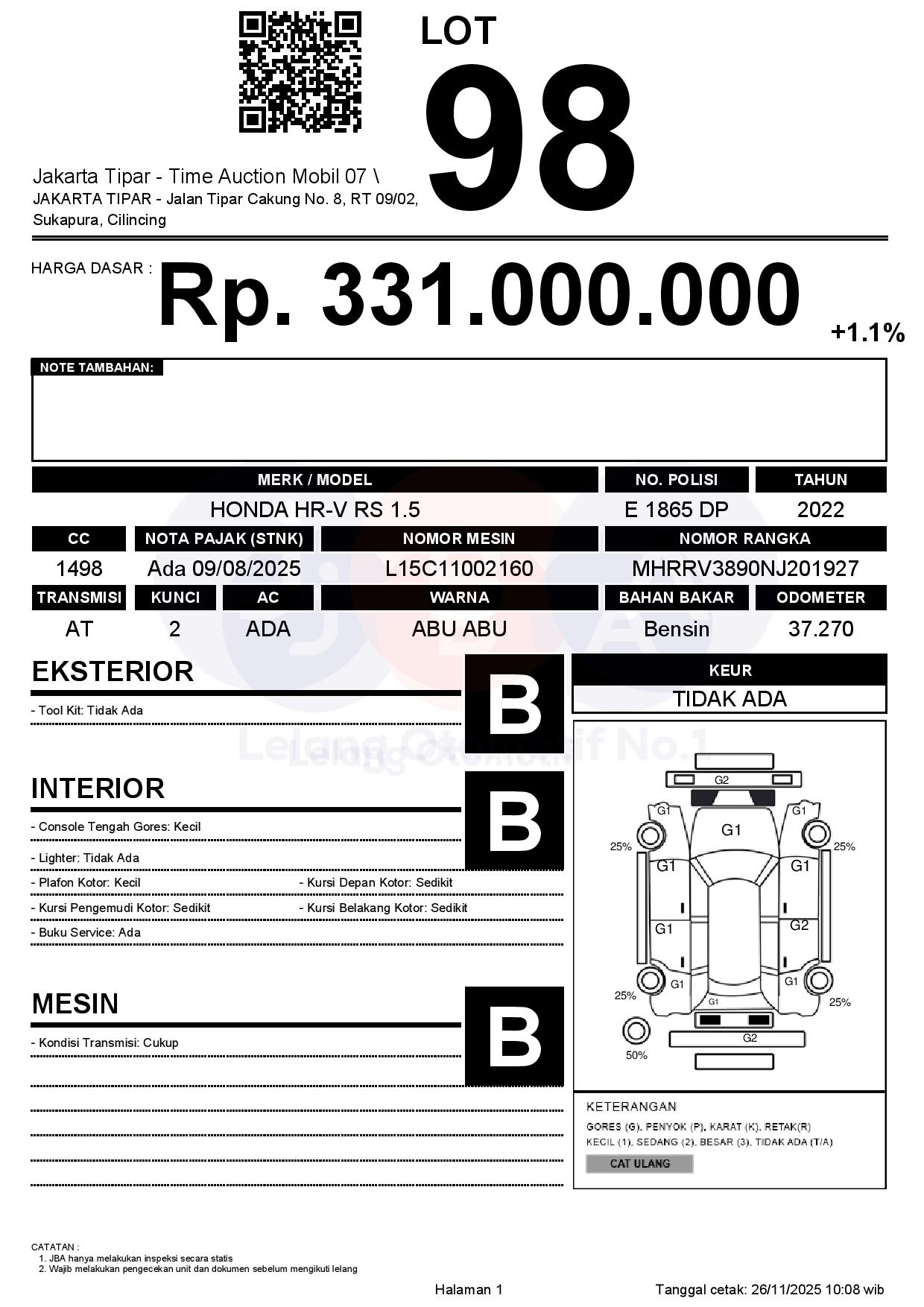 - Kondisi objek lelang dilelang apa adanya, baik kondisi fisik, mesin maupun legalitas kendaraan. Jika terdapat kekurangan/cacat baik yang terlihat maupun yang tidak terlihat, maka semua akan menjadi tanggung jawab/risiko Pemenang Lelang. Oleh karena itu, Pemenang Lelang melepaskan segala hak untuk menuntut dan/atau meminta ganti rugi atas hal tersebut kepada JBA.