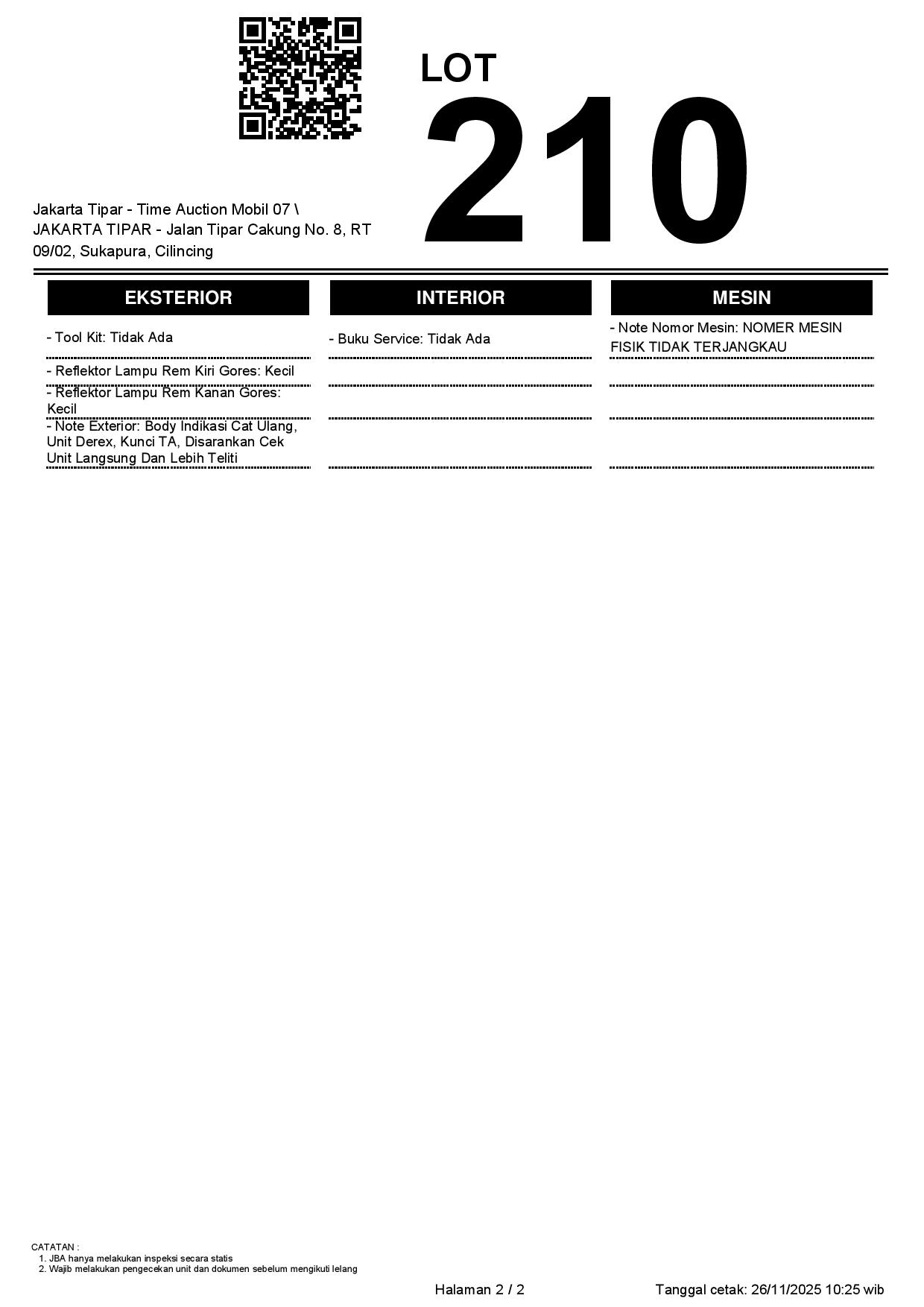 - Kondisi objek lelang dilelang apa adanya, baik kondisi fisik, mesin maupun legalitas kendaraan. Jika terdapat kekurangan/cacat baik yang terlihat maupun yang tidak terlihat, maka semua akan menjadi tanggung jawab/risiko Pemenang Lelang. Oleh karena itu, Pemenang Lelang melepaskan segala hak untuk menuntut dan/atau meminta ganti rugi atas hal tersebut kepada JBA.