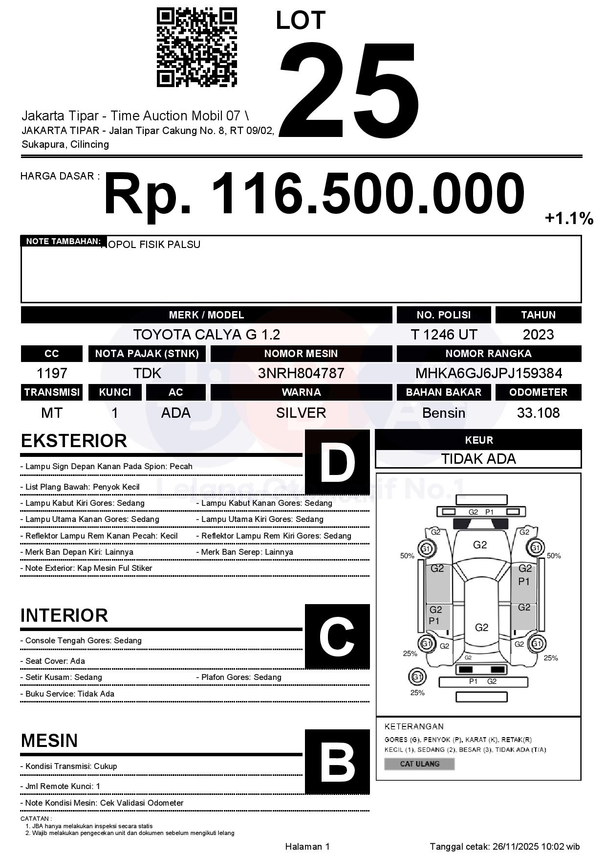 - Kondisi objek lelang dilelang apa adanya, baik kondisi fisik, mesin maupun legalitas kendaraan. Jika terdapat kekurangan/cacat baik yang terlihat maupun yang tidak terlihat, maka semua akan menjadi tanggung jawab/risiko Pemenang Lelang. Oleh karena itu, Pemenang Lelang melepaskan segala hak untuk menuntut dan/atau meminta ganti rugi atas hal tersebut kepada JBA.
