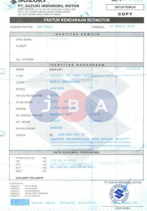 - Kondisi objek lelang dilelang apa adanya, baik kondisi fisik, mesin maupun legalitas kendaraan. Jika terdapat kekurangan/cacat baik yang terlihat maupun yang tidak terlihat, maka semua akan menjadi tanggung jawab/risiko Pemenang Lelang. Oleh karena itu, Pemenang Lelang melepaskan segala hak untuk menuntut dan/atau meminta ganti rugi atas hal tersebut kepada JBA.