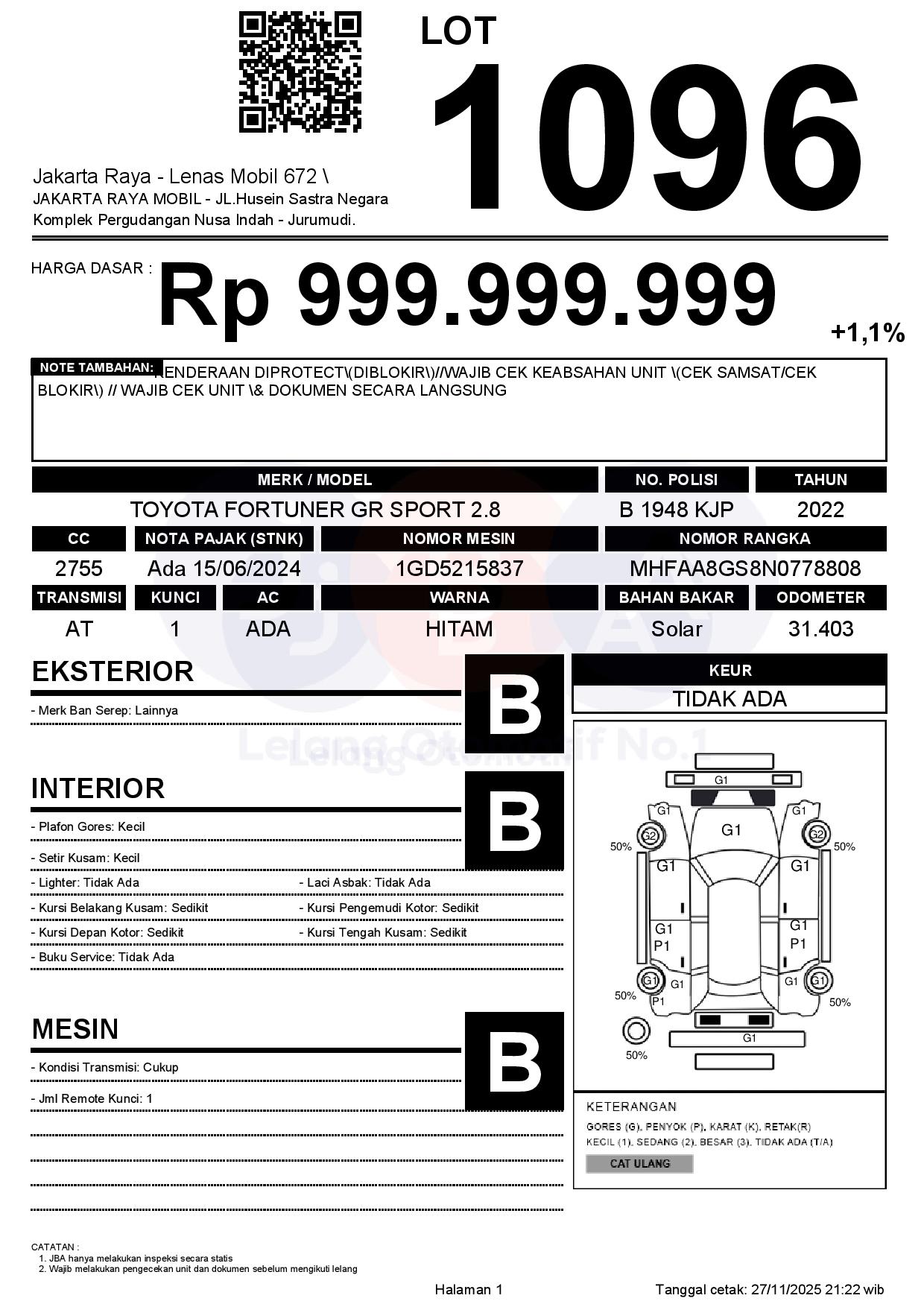 - Kondisi objek lelang dilelang apa adanya, baik kondisi fisik, mesin maupun legalitas kendaraan. Jika terdapat kekurangan/cacat baik yang terlihat maupun yang tidak terlihat, maka semua akan menjadi tanggung jawab/risiko Pemenang Lelang. Oleh karena itu, Pemenang Lelang melepaskan segala hak untuk menuntut dan/atau meminta ganti rugi atas hal tersebut kepada JBA.