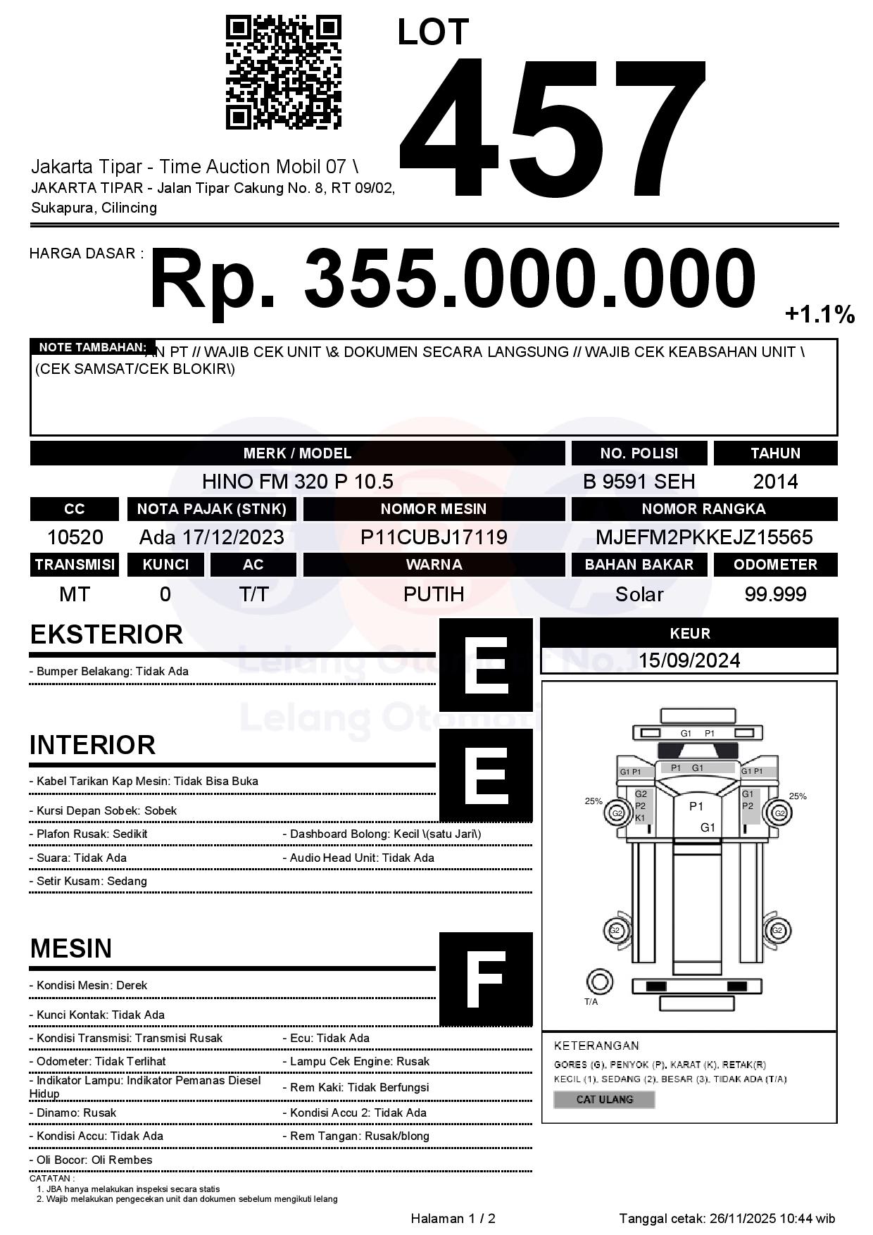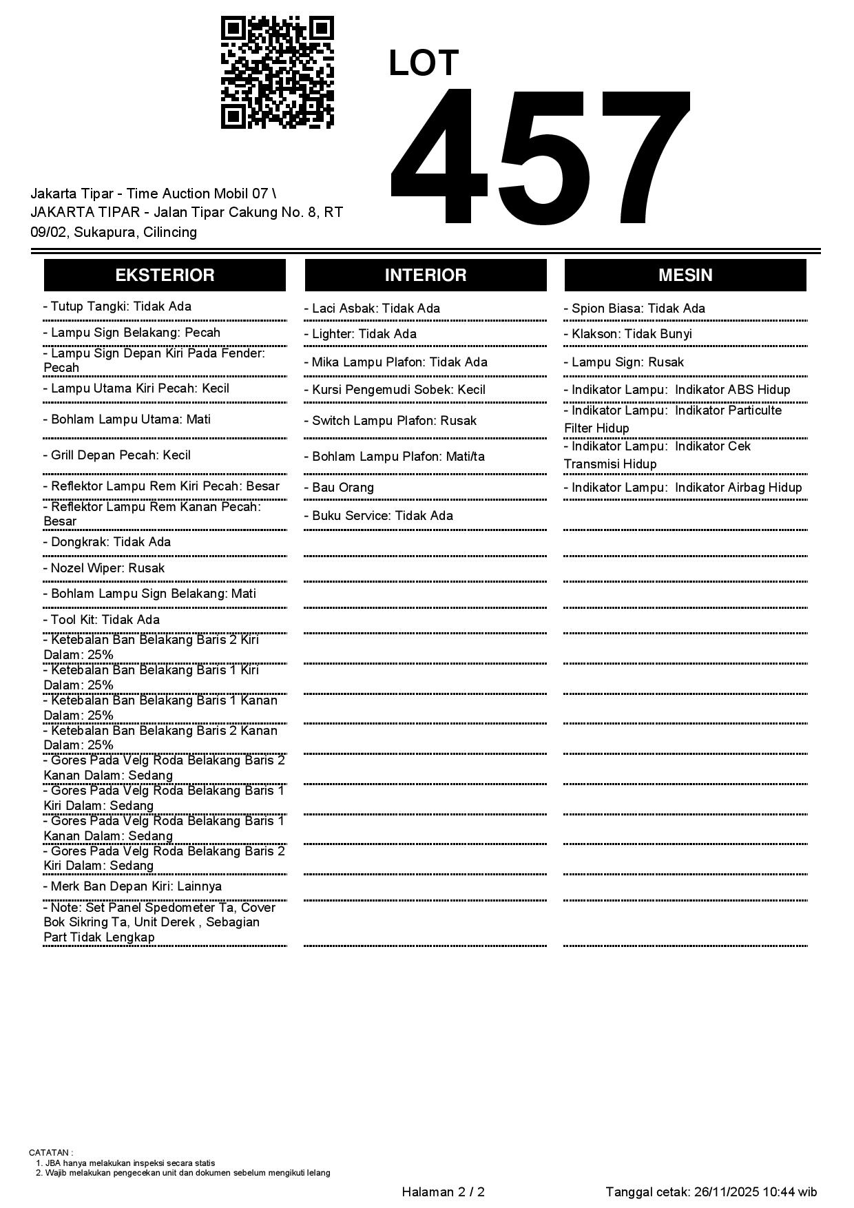 - Kondisi objek lelang dilelang apa adanya, baik kondisi fisik, mesin maupun legalitas kendaraan. Jika terdapat kekurangan/cacat baik yang terlihat maupun yang tidak terlihat, maka semua akan menjadi tanggung jawab/risiko Pemenang Lelang. Oleh karena itu, Pemenang Lelang melepaskan segala hak untuk menuntut dan/atau meminta ganti rugi atas hal tersebut kepada JBA.