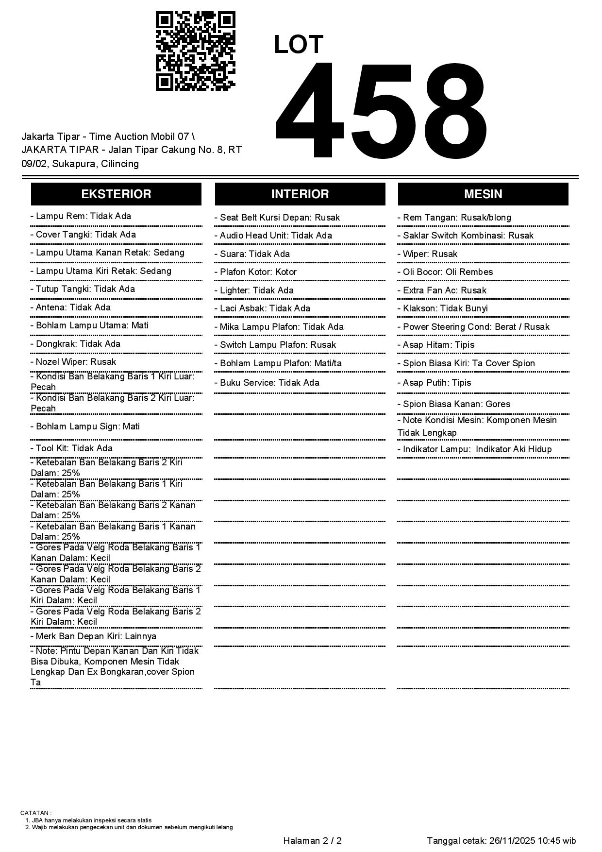 - Kondisi objek lelang dilelang apa adanya, baik kondisi fisik, mesin maupun legalitas kendaraan. Jika terdapat kekurangan/cacat baik yang terlihat maupun yang tidak terlihat, maka semua akan menjadi tanggung jawab/risiko Pemenang Lelang. Oleh karena itu, Pemenang Lelang melepaskan segala hak untuk menuntut dan/atau meminta ganti rugi atas hal tersebut kepada JBA.