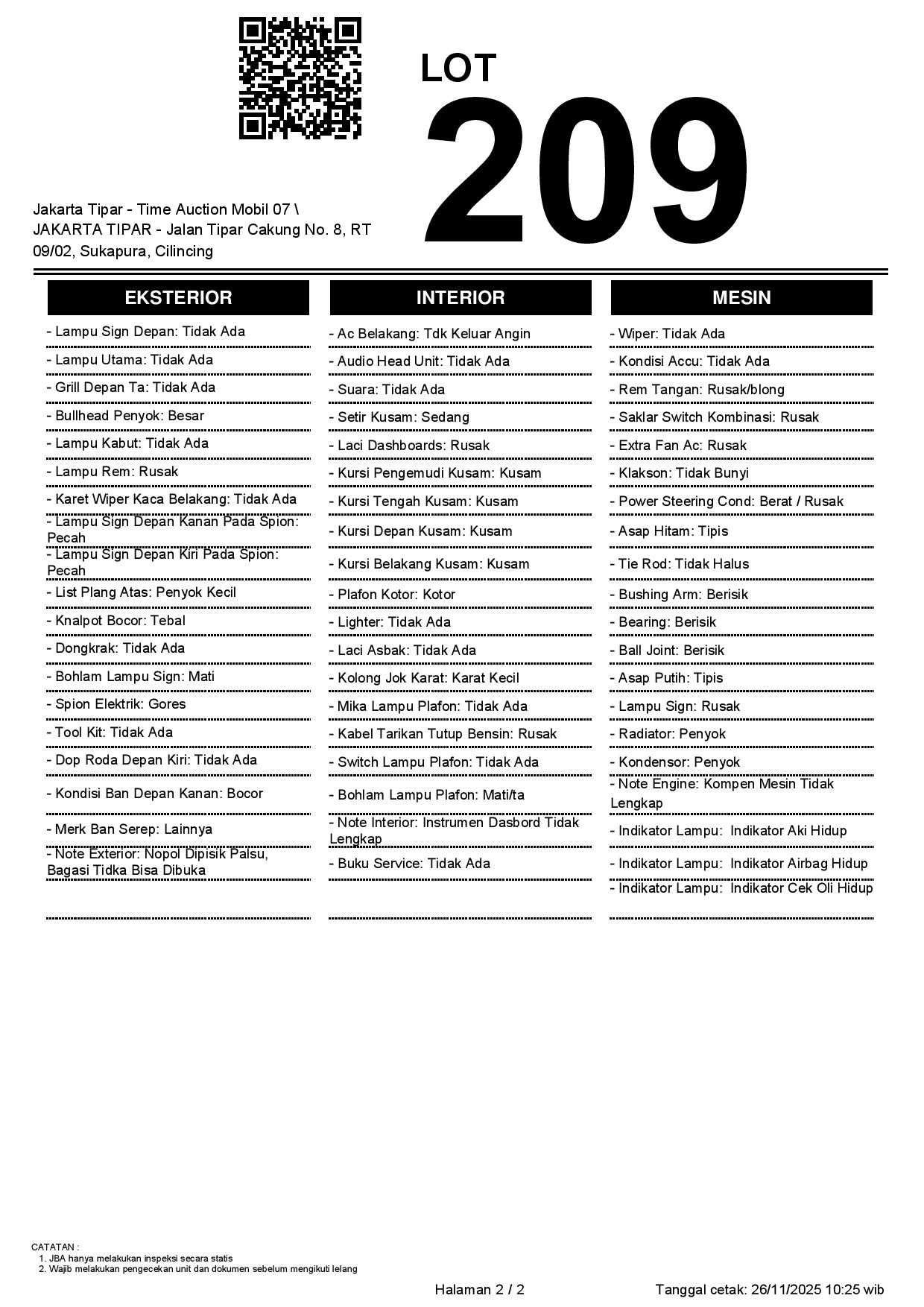 - Kondisi objek lelang dilelang apa adanya, baik kondisi fisik, mesin maupun legalitas kendaraan. Jika terdapat kekurangan/cacat baik yang terlihat maupun yang tidak terlihat, maka semua akan menjadi tanggung jawab/risiko Pemenang Lelang. Oleh karena itu, Pemenang Lelang melepaskan segala hak untuk menuntut dan/atau meminta ganti rugi atas hal tersebut kepada JBA.
