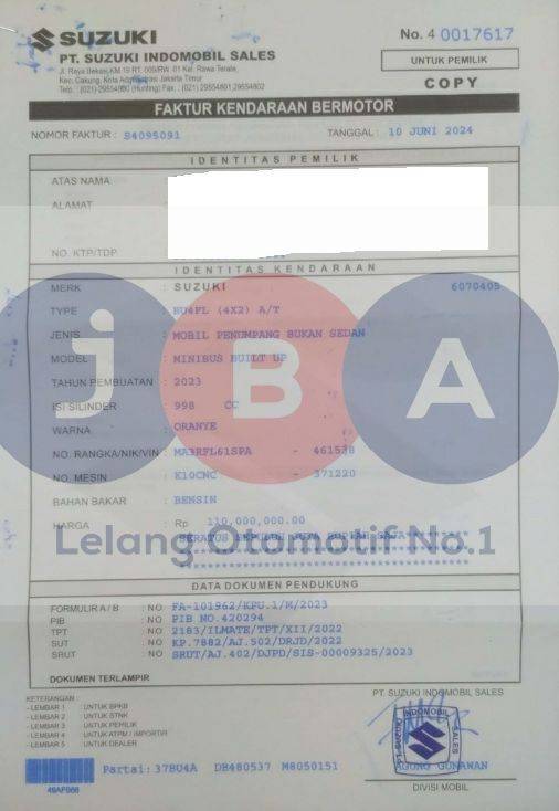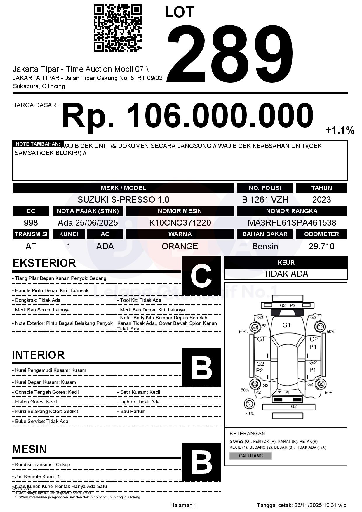 - Kondisi objek lelang dilelang apa adanya, baik kondisi fisik, mesin maupun legalitas kendaraan. Jika terdapat kekurangan/cacat baik yang terlihat maupun yang tidak terlihat, maka semua akan menjadi tanggung jawab/risiko Pemenang Lelang. Oleh karena itu, Pemenang Lelang melepaskan segala hak untuk menuntut dan/atau meminta ganti rugi atas hal tersebut kepada JBA.