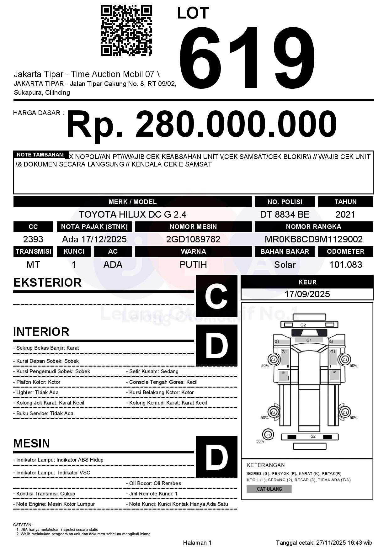 - Kondisi objek lelang dilelang apa adanya, baik kondisi fisik, mesin maupun legalitas kendaraan. Jika terdapat kekurangan/cacat baik yang terlihat maupun yang tidak terlihat, maka semua akan menjadi tanggung jawab/risiko Pemenang Lelang. Oleh karena itu, Pemenang Lelang melepaskan segala hak untuk menuntut dan/atau meminta ganti rugi atas hal tersebut kepada JBA.