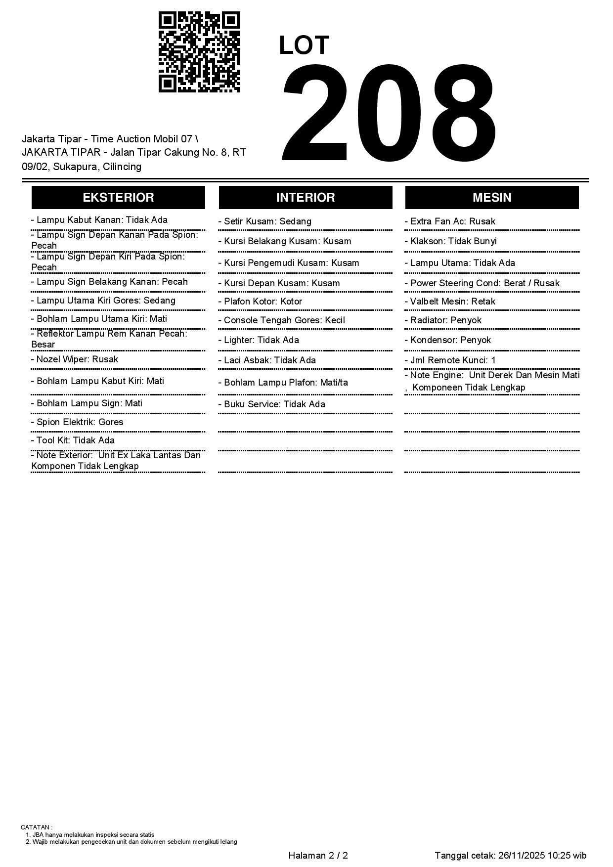 - Kondisi objek lelang dilelang apa adanya, baik kondisi fisik, mesin maupun legalitas kendaraan. Jika terdapat kekurangan/cacat baik yang terlihat maupun yang tidak terlihat, maka semua akan menjadi tanggung jawab/risiko Pemenang Lelang. Oleh karena itu, Pemenang Lelang melepaskan segala hak untuk menuntut dan/atau meminta ganti rugi atas hal tersebut kepada JBA.