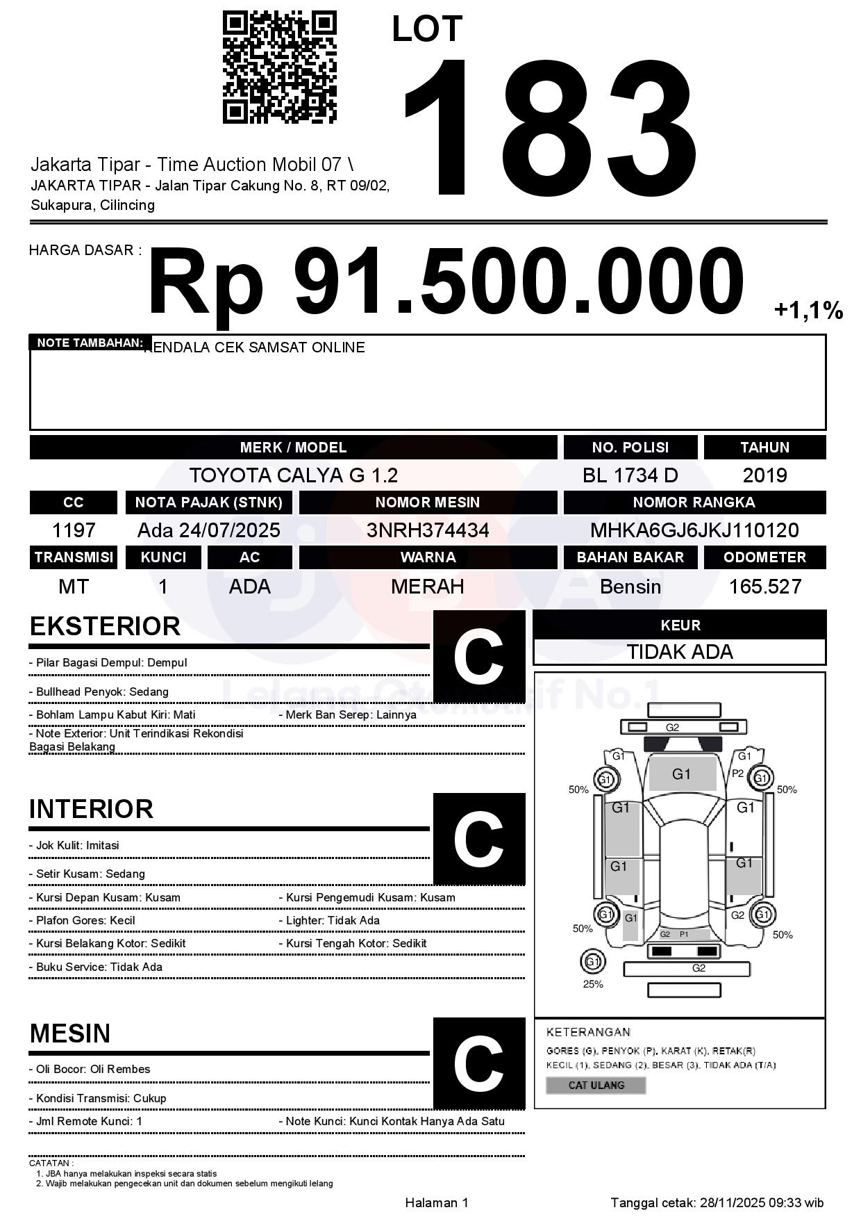 - Kondisi objek lelang dilelang apa adanya, baik kondisi fisik, mesin maupun legalitas kendaraan. Jika terdapat kekurangan/cacat baik yang terlihat maupun yang tidak terlihat, maka semua akan menjadi tanggung jawab/risiko Pemenang Lelang. Oleh karena itu, Pemenang Lelang melepaskan segala hak untuk menuntut dan/atau meminta ganti rugi atas hal tersebut kepada JBA.