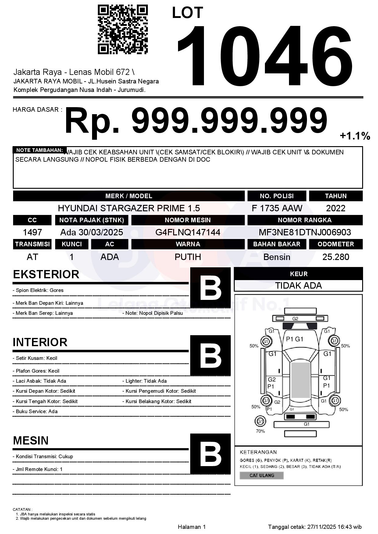 - Kondisi objek lelang dilelang apa adanya, baik kondisi fisik, mesin maupun legalitas kendaraan. Jika terdapat kekurangan/cacat baik yang terlihat maupun yang tidak terlihat, maka semua akan menjadi tanggung jawab/risiko Pemenang Lelang. Oleh karena itu, Pemenang Lelang melepaskan segala hak untuk menuntut dan/atau meminta ganti rugi atas hal tersebut kepada JBA.