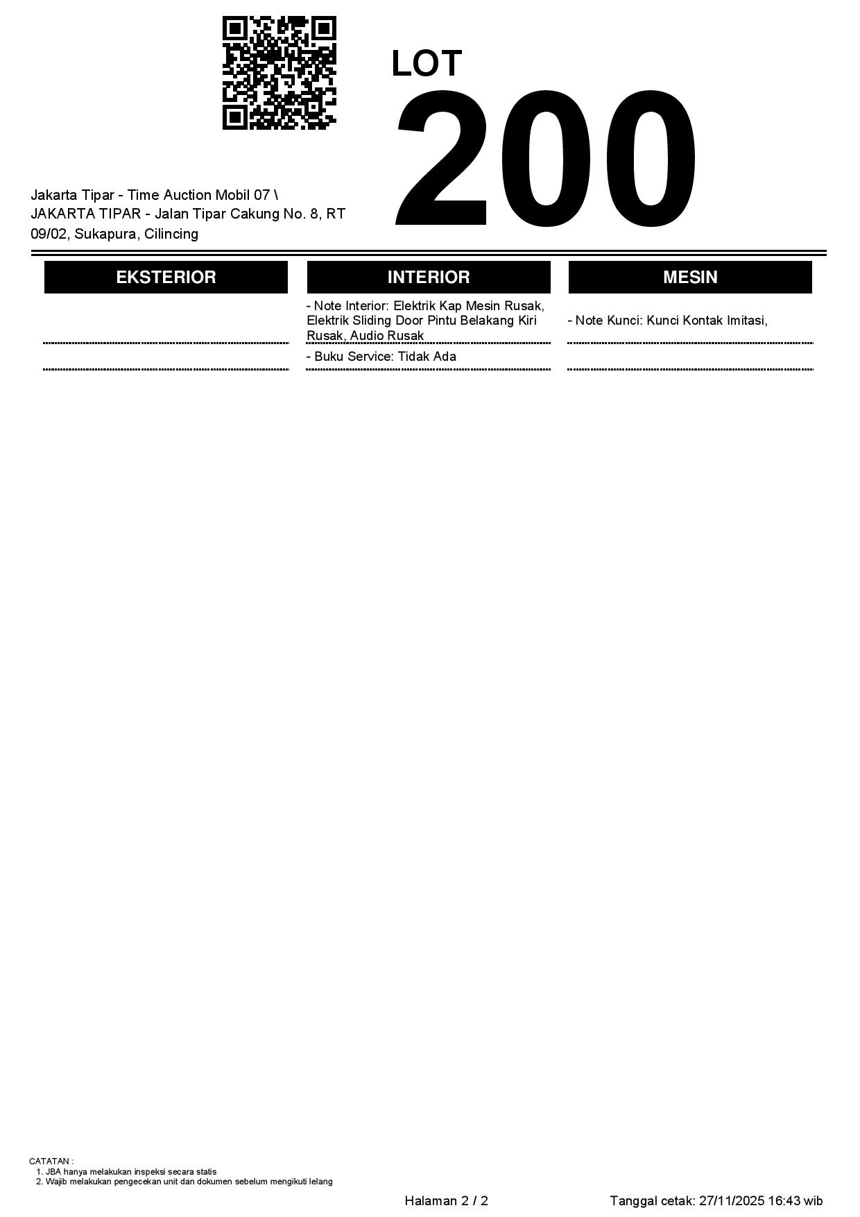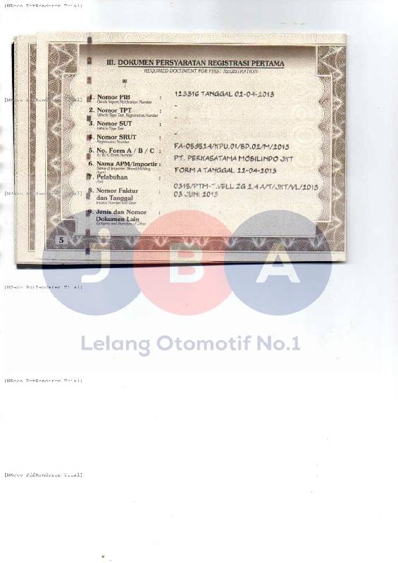 - Kondisi objek lelang dilelang apa adanya, baik kondisi fisik, mesin maupun legalitas kendaraan. Jika terdapat kekurangan/cacat baik yang terlihat maupun yang tidak terlihat, maka semua akan menjadi tanggung jawab/risiko Pemenang Lelang. Oleh karena itu, Pemenang Lelang melepaskan segala hak untuk menuntut dan/atau meminta ganti rugi atas hal tersebut kepada JBA.
