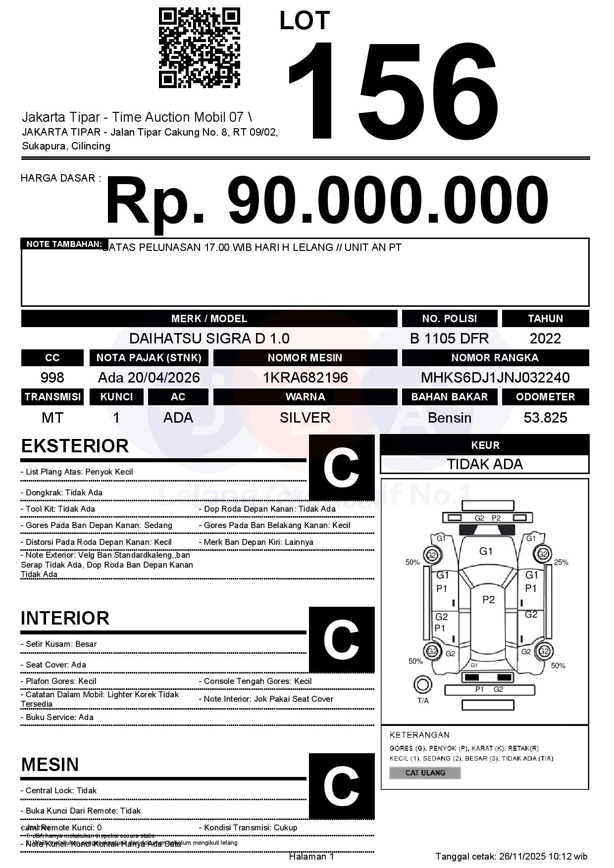 - Kondisi objek lelang dilelang apa adanya, baik kondisi fisik, mesin maupun legalitas kendaraan. Jika terdapat kekurangan/cacat baik yang terlihat maupun yang tidak terlihat, maka semua akan menjadi tanggung jawab/risiko Pemenang Lelang. Oleh karena itu, Pemenang Lelang melepaskan segala hak untuk menuntut dan/atau meminta ganti rugi atas hal tersebut kepada JBA.