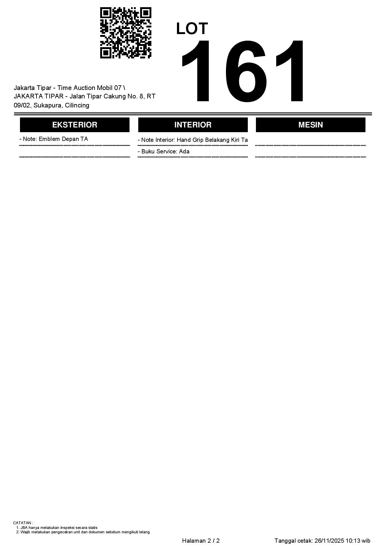 - Kondisi objek lelang dilelang apa adanya, baik kondisi fisik, mesin maupun legalitas kendaraan. Jika terdapat kekurangan/cacat baik yang terlihat maupun yang tidak terlihat, maka semua akan menjadi tanggung jawab/risiko Pemenang Lelang. Oleh karena itu, Pemenang Lelang melepaskan segala hak untuk menuntut dan/atau meminta ganti rugi atas hal tersebut kepada JBA.