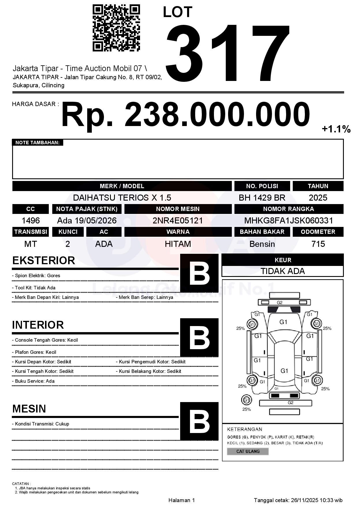 - Kondisi objek lelang dilelang apa adanya, baik kondisi fisik, mesin maupun legalitas kendaraan. Jika terdapat kekurangan/cacat baik yang terlihat maupun yang tidak terlihat, maka semua akan menjadi tanggung jawab/risiko Pemenang Lelang. Oleh karena itu, Pemenang Lelang melepaskan segala hak untuk menuntut dan/atau meminta ganti rugi atas hal tersebut kepada JBA.
