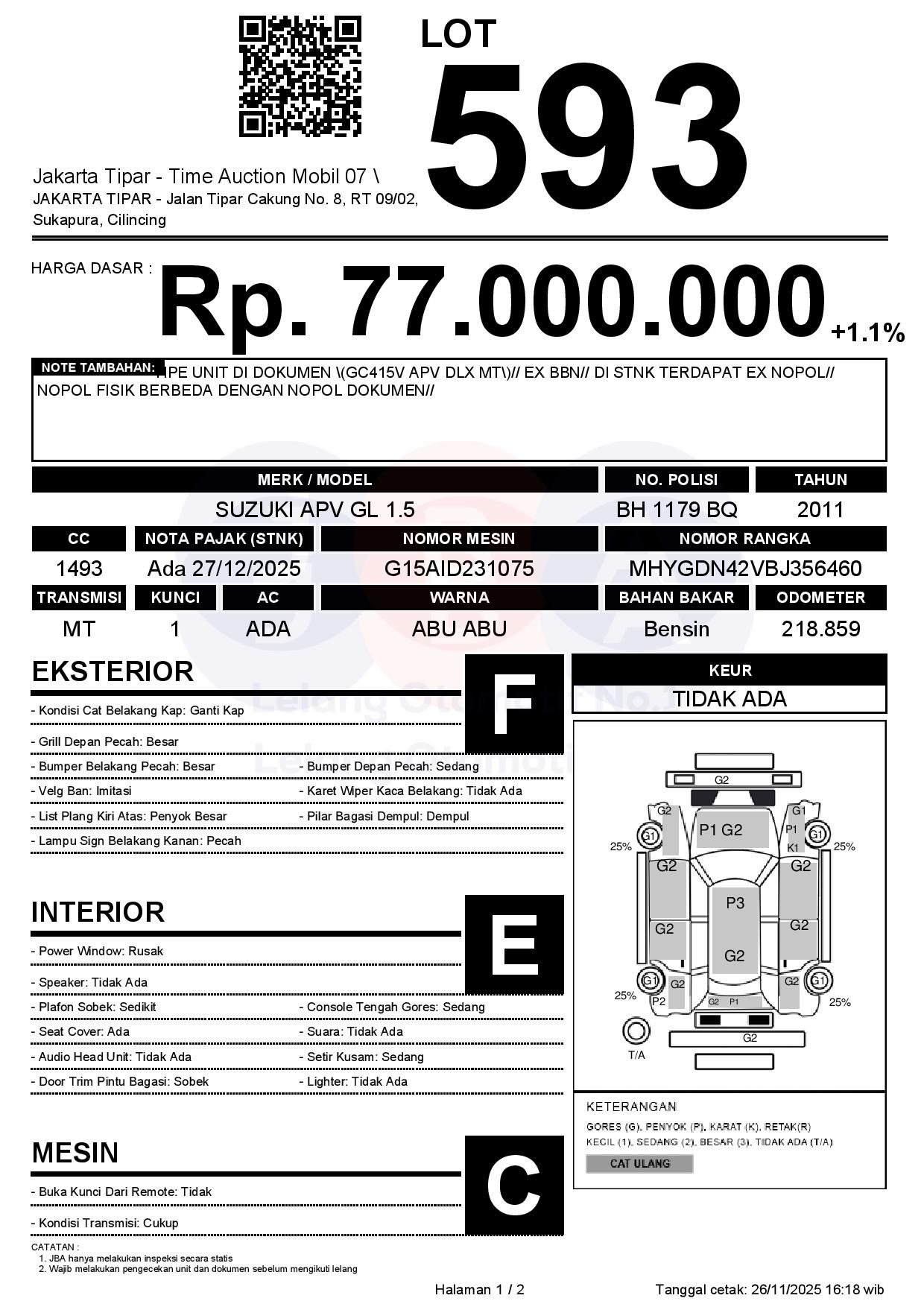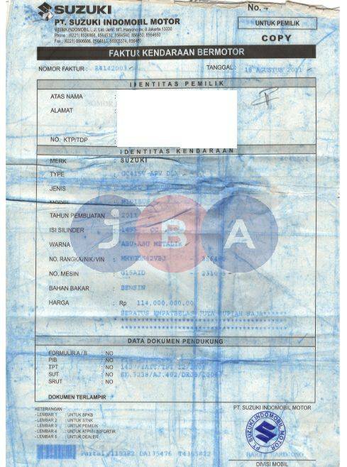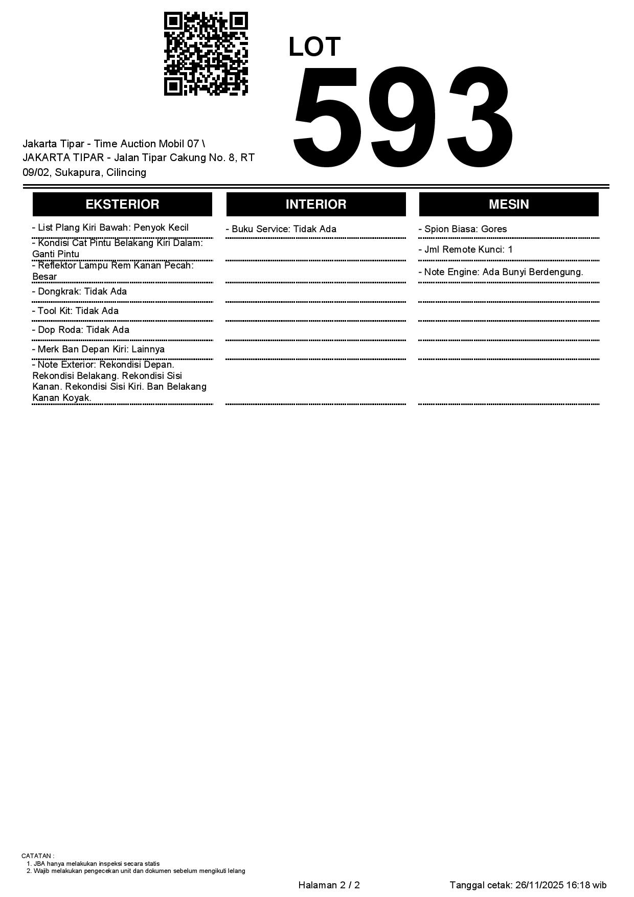 - Kondisi objek lelang dilelang apa adanya, baik kondisi fisik, mesin maupun legalitas kendaraan. Jika terdapat kekurangan/cacat baik yang terlihat maupun yang tidak terlihat, maka semua akan menjadi tanggung jawab/risiko Pemenang Lelang. Oleh karena itu, Pemenang Lelang melepaskan segala hak untuk menuntut dan/atau meminta ganti rugi atas hal tersebut kepada JBA.
