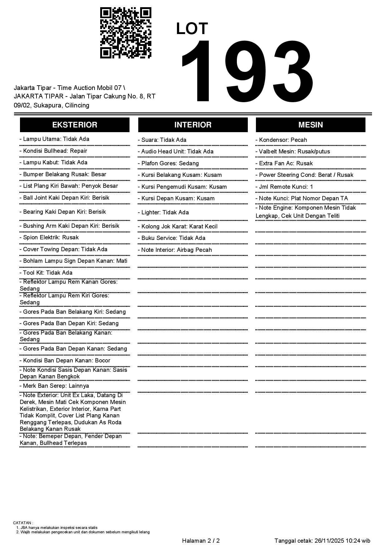 - Kondisi objek lelang dilelang apa adanya, baik kondisi fisik, mesin maupun legalitas kendaraan. Jika terdapat kekurangan/cacat baik yang terlihat maupun yang tidak terlihat, maka semua akan menjadi tanggung jawab/risiko Pemenang Lelang. Oleh karena itu, Pemenang Lelang melepaskan segala hak untuk menuntut dan/atau meminta ganti rugi atas hal tersebut kepada JBA.