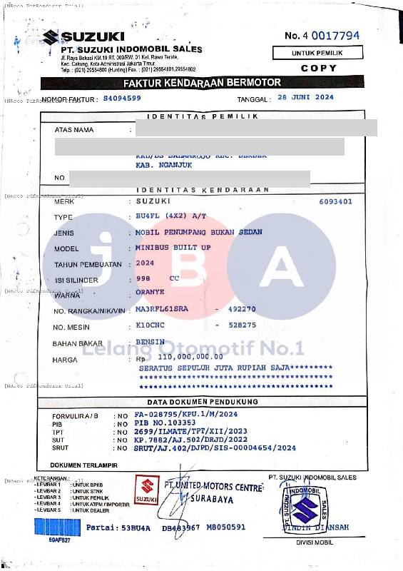 - Kondisi objek lelang dilelang apa adanya, baik kondisi fisik, mesin maupun legalitas kendaraan. Jika terdapat kekurangan/cacat baik yang terlihat maupun yang tidak terlihat, maka semua akan menjadi tanggung jawab/risiko Pemenang Lelang. Oleh karena itu, Pemenang Lelang melepaskan segala hak untuk menuntut dan/atau meminta ganti rugi atas hal tersebut kepada JBA.