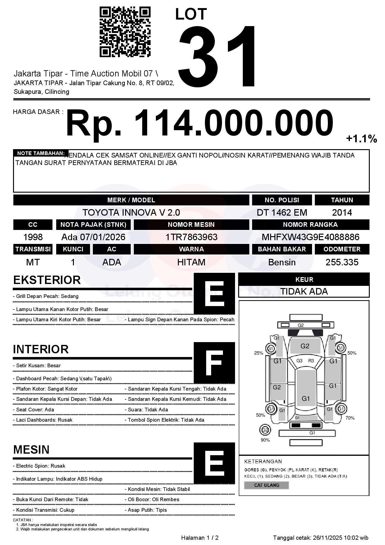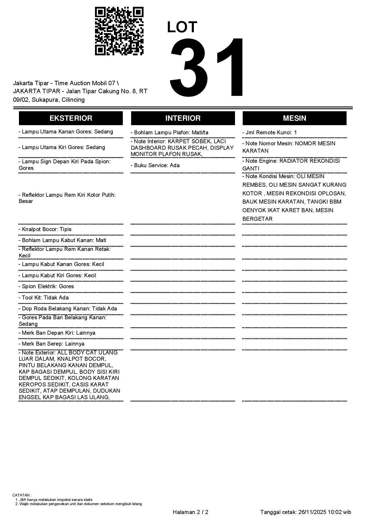 - Kondisi objek lelang dilelang apa adanya, baik kondisi fisik, mesin maupun legalitas kendaraan. Jika terdapat kekurangan/cacat baik yang terlihat maupun yang tidak terlihat, maka semua akan menjadi tanggung jawab/risiko Pemenang Lelang. Oleh karena itu, Pemenang Lelang melepaskan segala hak untuk menuntut dan/atau meminta ganti rugi atas hal tersebut kepada JBA.