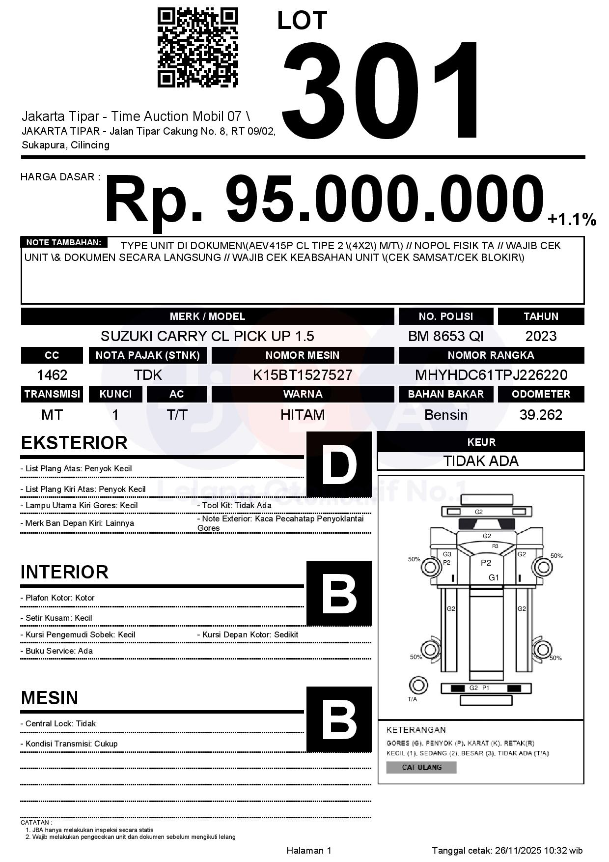 - Kondisi objek lelang dilelang apa adanya, baik kondisi fisik, mesin maupun legalitas kendaraan. Jika terdapat kekurangan/cacat baik yang terlihat maupun yang tidak terlihat, maka semua akan menjadi tanggung jawab/risiko Pemenang Lelang. Oleh karena itu, Pemenang Lelang melepaskan segala hak untuk menuntut dan/atau meminta ganti rugi atas hal tersebut kepada JBA.