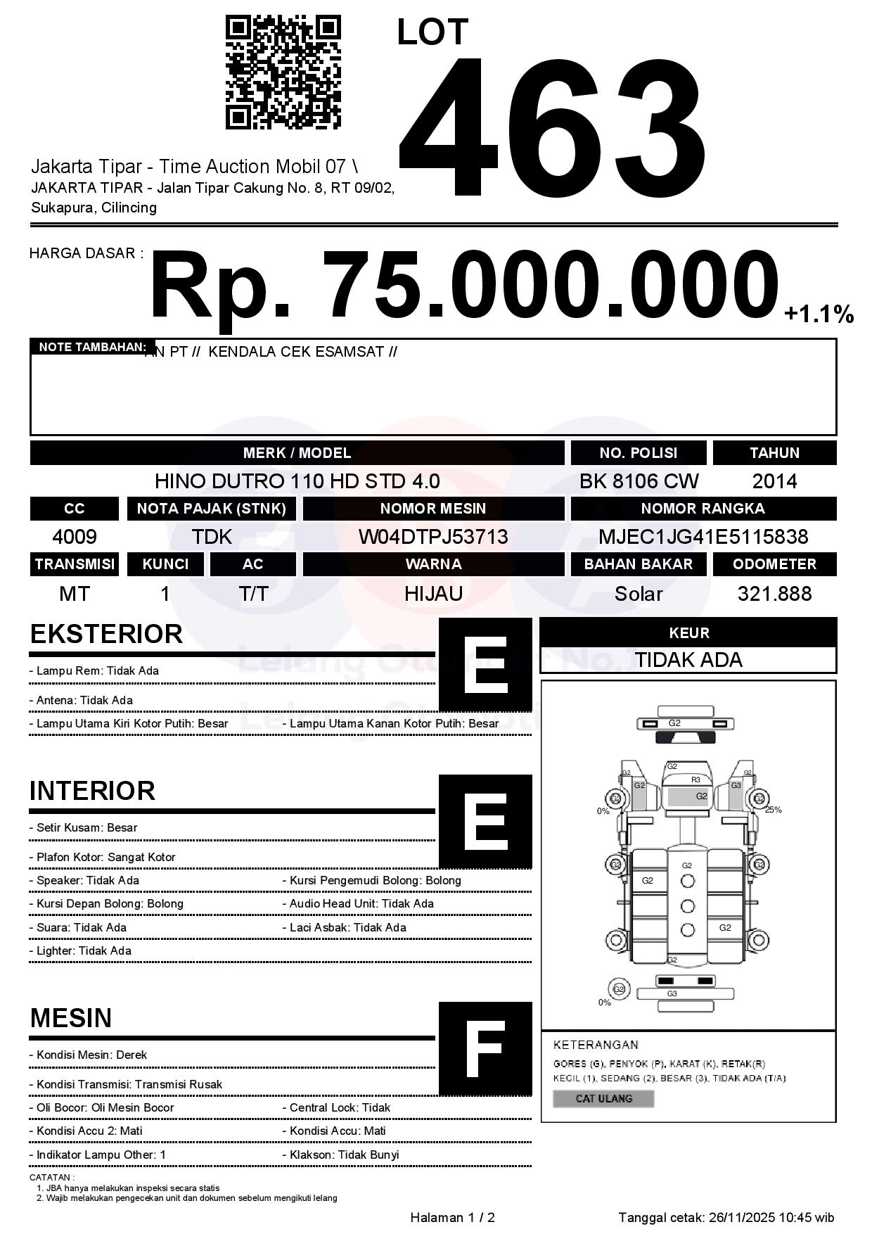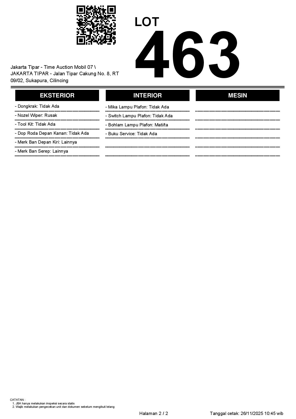- Kondisi objek lelang dilelang apa adanya, baik kondisi fisik, mesin maupun legalitas kendaraan. Jika terdapat kekurangan/cacat baik yang terlihat maupun yang tidak terlihat, maka semua akan menjadi tanggung jawab/risiko Pemenang Lelang. Oleh karena itu, Pemenang Lelang melepaskan segala hak untuk menuntut dan/atau meminta ganti rugi atas hal tersebut kepada JBA.