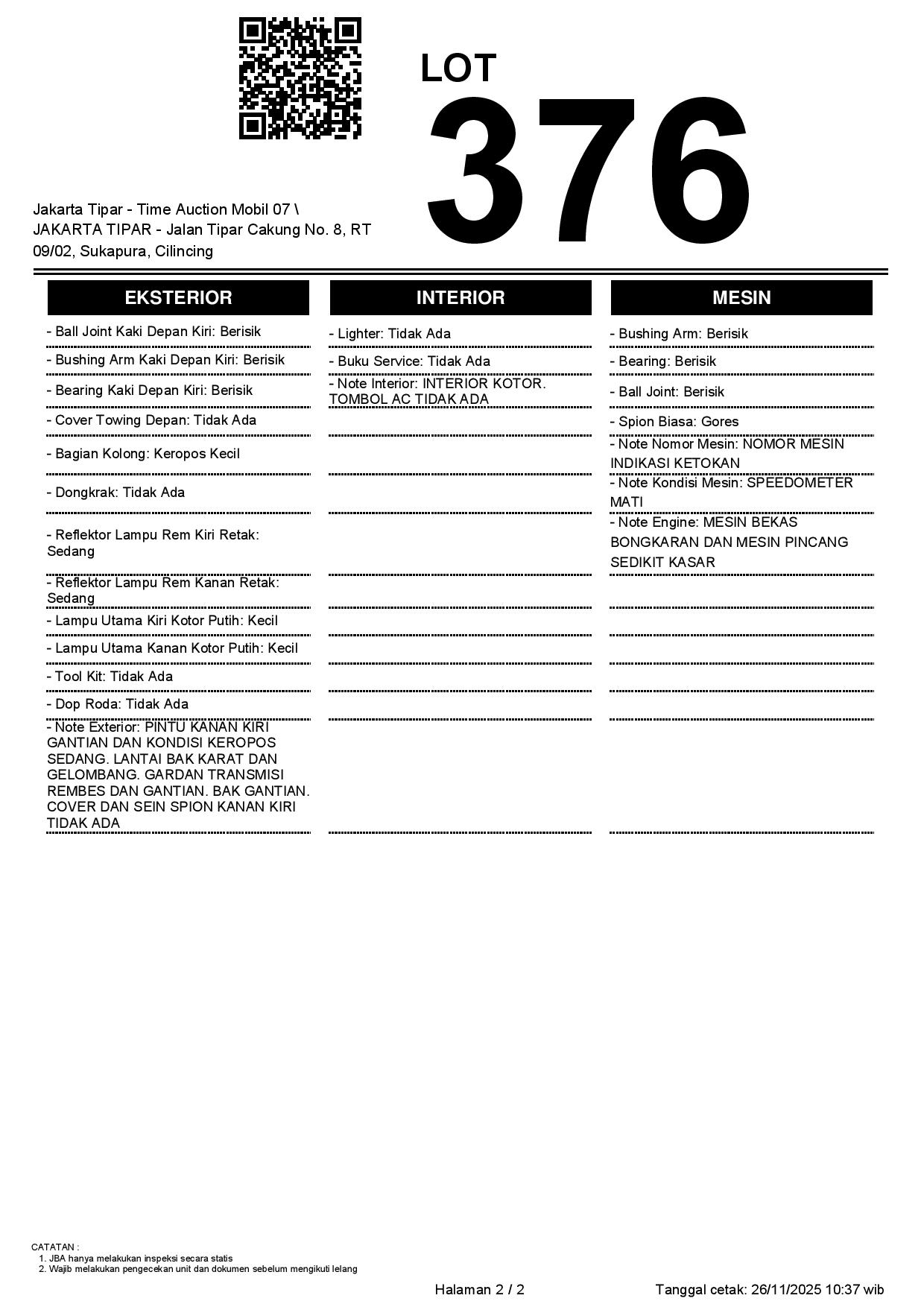 - Kondisi objek lelang dilelang apa adanya, baik kondisi fisik, mesin maupun legalitas kendaraan. Jika terdapat kekurangan/cacat baik yang terlihat maupun yang tidak terlihat, maka semua akan menjadi tanggung jawab/risiko Pemenang Lelang. Oleh karena itu, Pemenang Lelang melepaskan segala hak untuk menuntut dan/atau meminta ganti rugi atas hal tersebut kepada JBA.