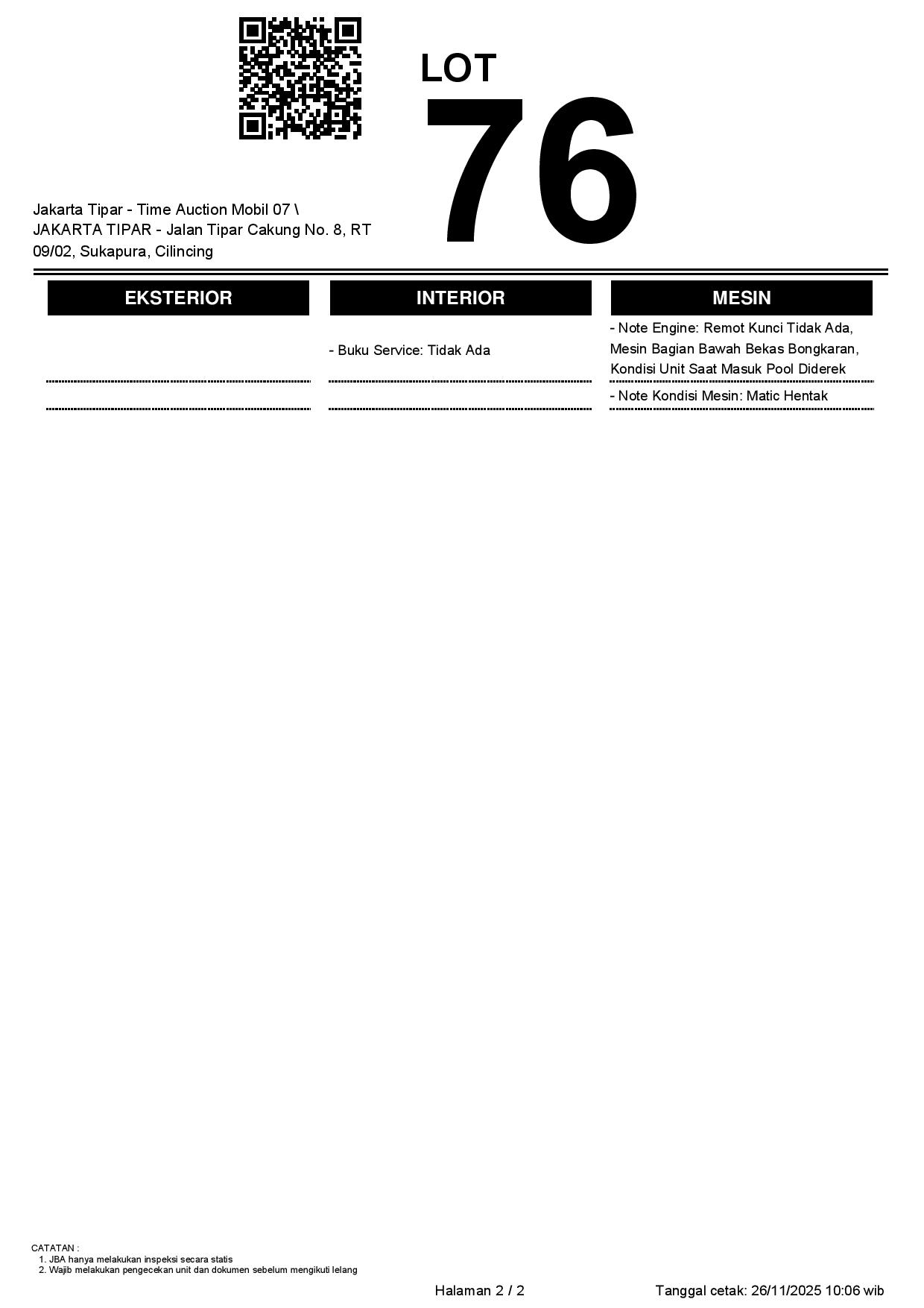- Kondisi objek lelang dilelang apa adanya, baik kondisi fisik, mesin maupun legalitas kendaraan. Jika terdapat kekurangan/cacat baik yang terlihat maupun yang tidak terlihat, maka semua akan menjadi tanggung jawab/risiko Pemenang Lelang. Oleh karena itu, Pemenang Lelang melepaskan segala hak untuk menuntut dan/atau meminta ganti rugi atas hal tersebut kepada JBA.