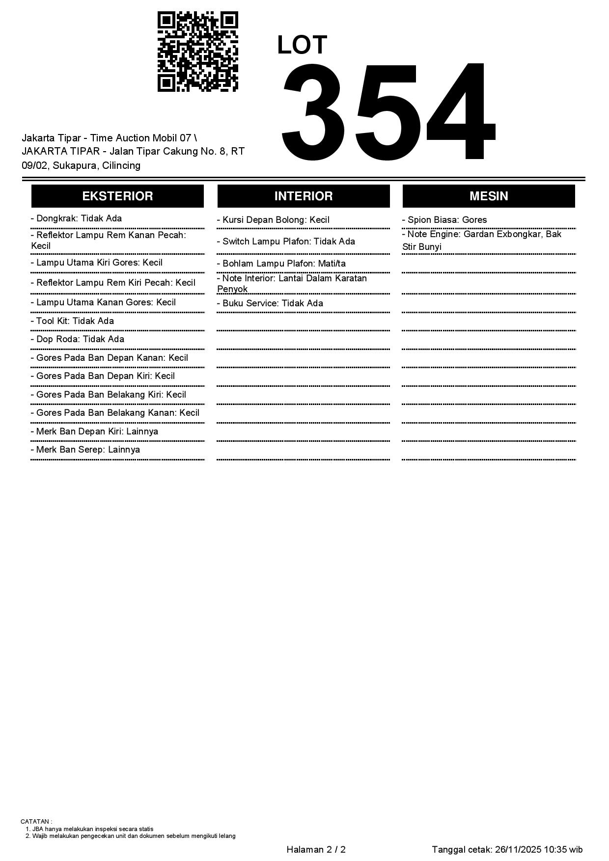 - Kondisi objek lelang dilelang apa adanya, baik kondisi fisik, mesin maupun legalitas kendaraan. Jika terdapat kekurangan/cacat baik yang terlihat maupun yang tidak terlihat, maka semua akan menjadi tanggung jawab/risiko Pemenang Lelang. Oleh karena itu, Pemenang Lelang melepaskan segala hak untuk menuntut dan/atau meminta ganti rugi atas hal tersebut kepada JBA.