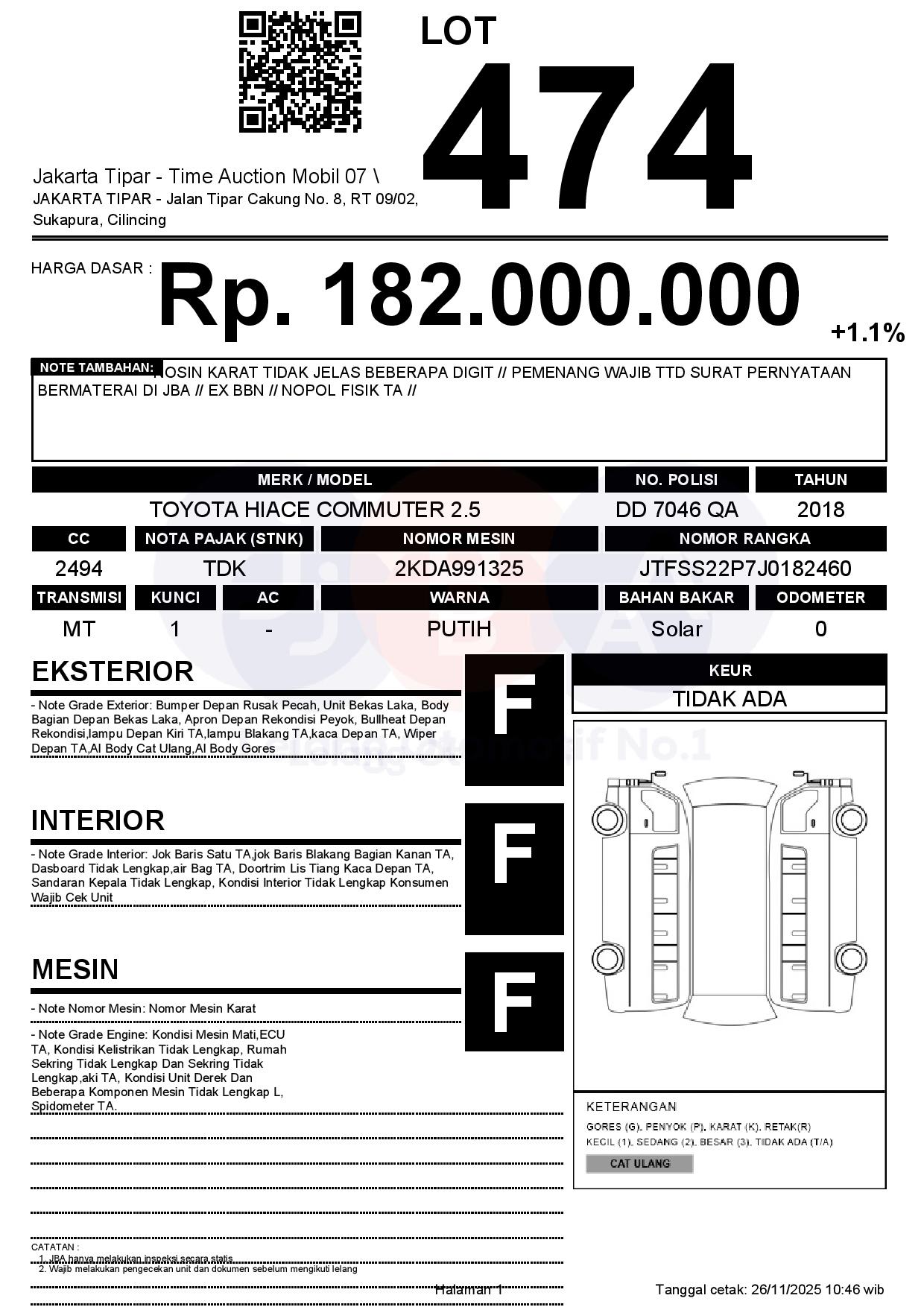 - Kondisi objek lelang dilelang apa adanya, baik kondisi fisik, mesin maupun legalitas kendaraan. Jika terdapat kekurangan/cacat baik yang terlihat maupun yang tidak terlihat, maka semua akan menjadi tanggung jawab/risiko Pemenang Lelang. Oleh karena itu, Pemenang Lelang melepaskan segala hak untuk menuntut dan/atau meminta ganti rugi atas hal tersebut kepada JBA.