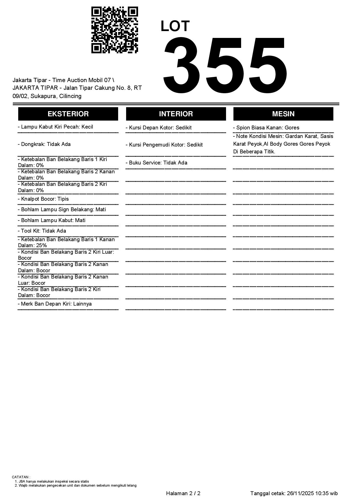 - Kondisi objek lelang dilelang apa adanya, baik kondisi fisik, mesin maupun legalitas kendaraan. Jika terdapat kekurangan/cacat baik yang terlihat maupun yang tidak terlihat, maka semua akan menjadi tanggung jawab/risiko Pemenang Lelang. Oleh karena itu, Pemenang Lelang melepaskan segala hak untuk menuntut dan/atau meminta ganti rugi atas hal tersebut kepada JBA.