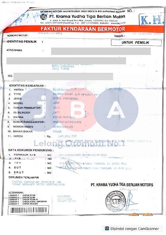 - Kondisi objek lelang dilelang apa adanya, baik kondisi fisik, mesin maupun legalitas kendaraan. Jika terdapat kekurangan/cacat baik yang terlihat maupun yang tidak terlihat, maka semua akan menjadi tanggung jawab/risiko Pemenang Lelang. Oleh karena itu, Pemenang Lelang melepaskan segala hak untuk menuntut dan/atau meminta ganti rugi atas hal tersebut kepada JBA.