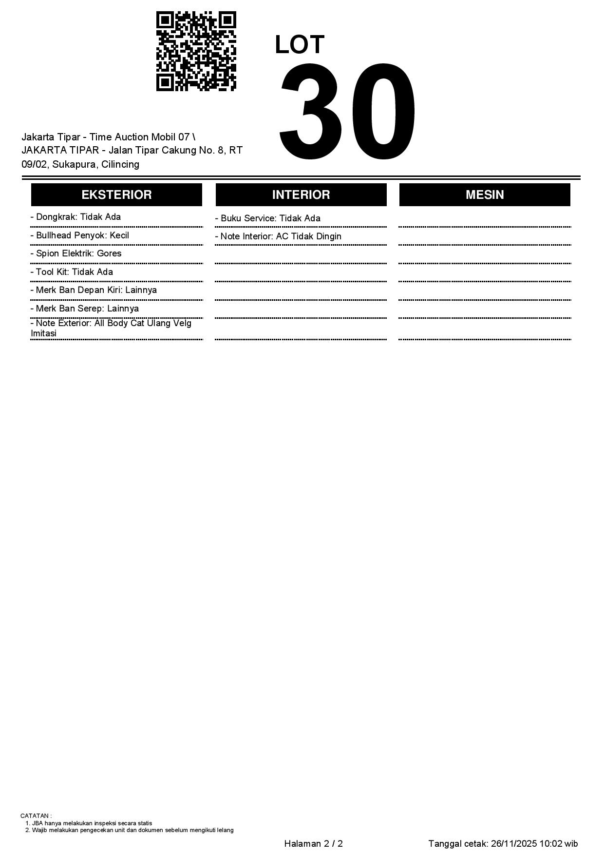 - Kondisi objek lelang dilelang apa adanya, baik kondisi fisik, mesin maupun legalitas kendaraan. Jika terdapat kekurangan/cacat baik yang terlihat maupun yang tidak terlihat, maka semua akan menjadi tanggung jawab/risiko Pemenang Lelang. Oleh karena itu, Pemenang Lelang melepaskan segala hak untuk menuntut dan/atau meminta ganti rugi atas hal tersebut kepada JBA.