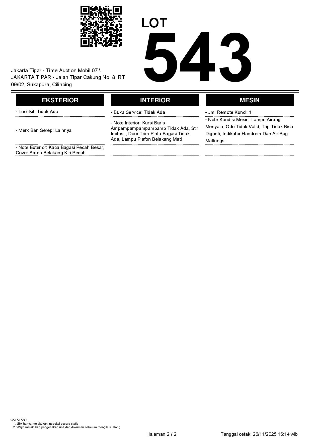 - Kondisi objek lelang dilelang apa adanya, baik kondisi fisik, mesin maupun legalitas kendaraan. Jika terdapat kekurangan/cacat baik yang terlihat maupun yang tidak terlihat, maka semua akan menjadi tanggung jawab/risiko Pemenang Lelang. Oleh karena itu, Pemenang Lelang melepaskan segala hak untuk menuntut dan/atau meminta ganti rugi atas hal tersebut kepada JBA.