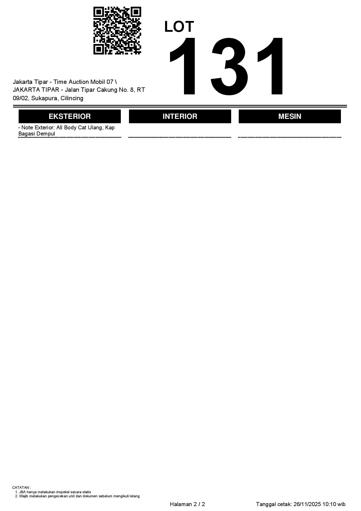 - Kondisi objek lelang dilelang apa adanya, baik kondisi fisik, mesin maupun legalitas kendaraan. Jika terdapat kekurangan/cacat baik yang terlihat maupun yang tidak terlihat, maka semua akan menjadi tanggung jawab/risiko Pemenang Lelang. Oleh karena itu, Pemenang Lelang melepaskan segala hak untuk menuntut dan/atau meminta ganti rugi atas hal tersebut kepada JBA.