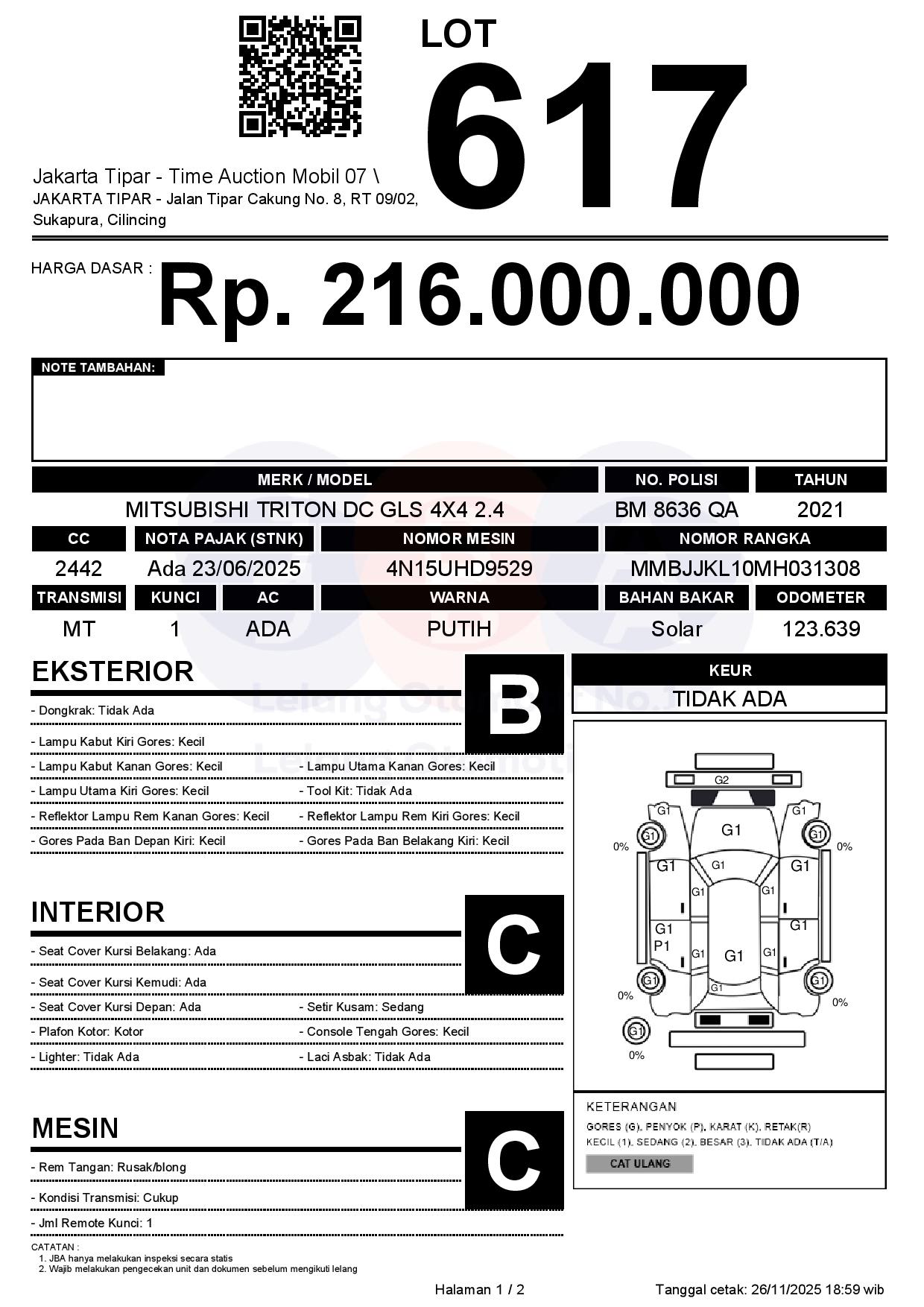 - Kondisi objek lelang dilelang apa adanya, baik kondisi fisik, mesin maupun legalitas kendaraan. Jika terdapat kekurangan/cacat baik yang terlihat maupun yang tidak terlihat, maka semua akan menjadi tanggung jawab/risiko Pemenang Lelang. Oleh karena itu, Pemenang Lelang melepaskan segala hak untuk menuntut dan/atau meminta ganti rugi atas hal tersebut kepada JBA.