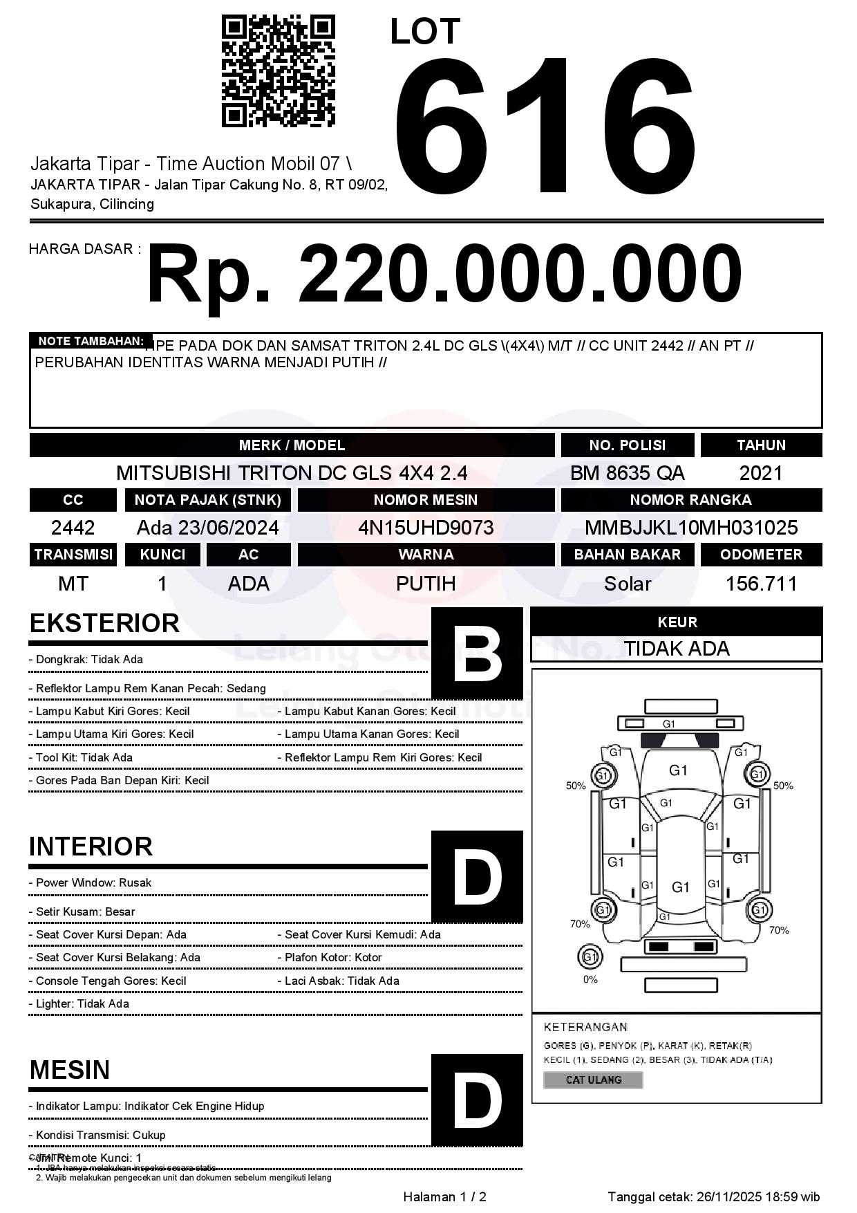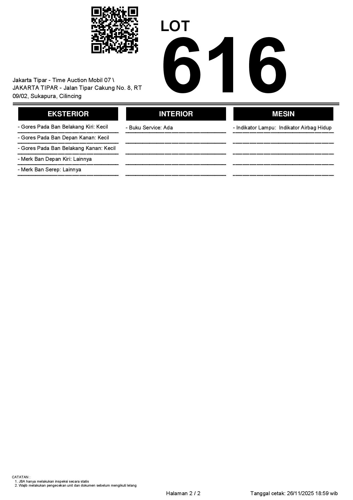 - Kondisi objek lelang dilelang apa adanya, baik kondisi fisik, mesin maupun legalitas kendaraan. Jika terdapat kekurangan/cacat baik yang terlihat maupun yang tidak terlihat, maka semua akan menjadi tanggung jawab/risiko Pemenang Lelang. Oleh karena itu, Pemenang Lelang melepaskan segala hak untuk menuntut dan/atau meminta ganti rugi atas hal tersebut kepada JBA.
