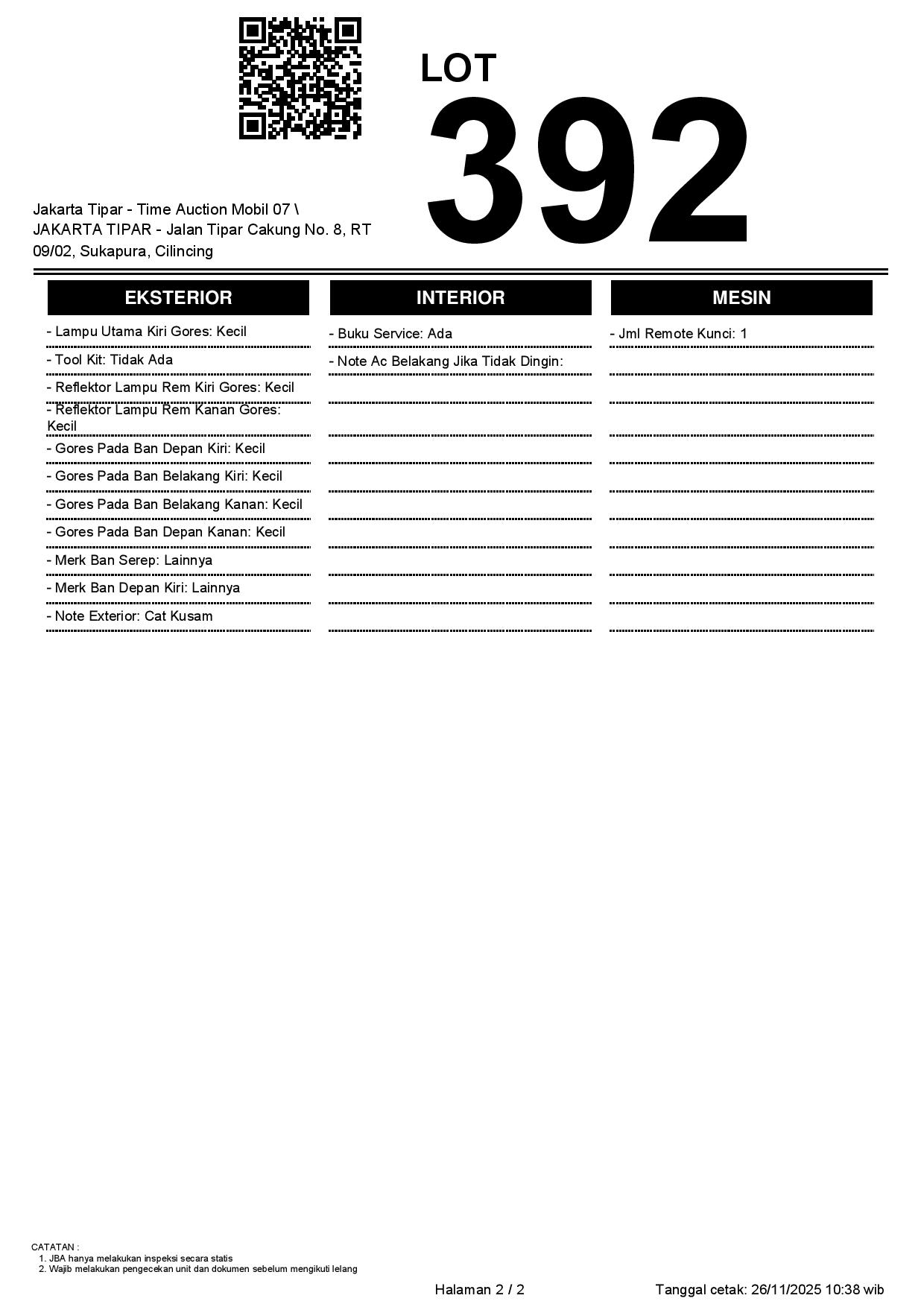 - Kondisi objek lelang dilelang apa adanya, baik kondisi fisik, mesin maupun legalitas kendaraan. Jika terdapat kekurangan/cacat baik yang terlihat maupun yang tidak terlihat, maka semua akan menjadi tanggung jawab/risiko Pemenang Lelang. Oleh karena itu, Pemenang Lelang melepaskan segala hak untuk menuntut dan/atau meminta ganti rugi atas hal tersebut kepada JBA.