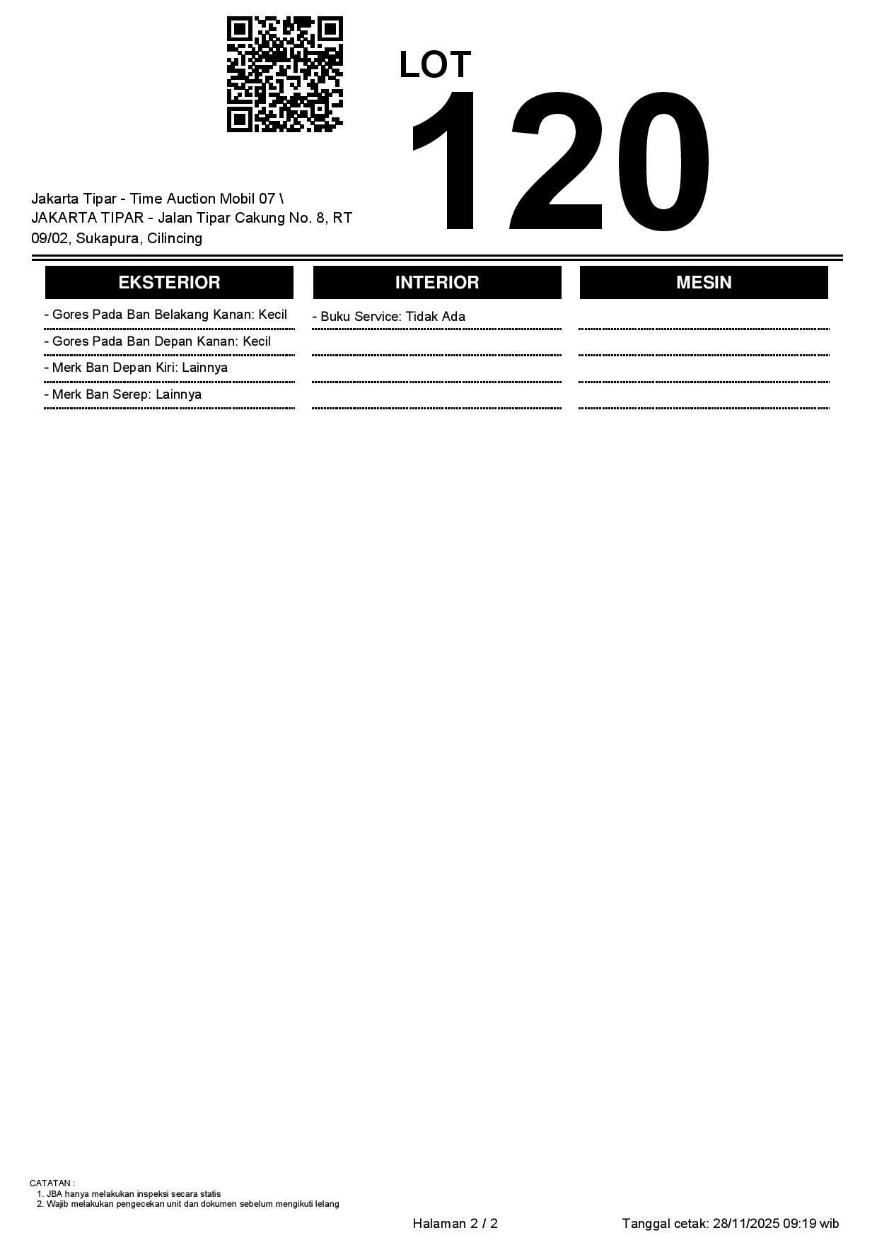 - Kondisi objek lelang dilelang apa adanya, baik kondisi fisik, mesin maupun legalitas kendaraan. Jika terdapat kekurangan/cacat baik yang terlihat maupun yang tidak terlihat, maka semua akan menjadi tanggung jawab/risiko Pemenang Lelang. Oleh karena itu, Pemenang Lelang melepaskan segala hak untuk menuntut dan/atau meminta ganti rugi atas hal tersebut kepada JBA.