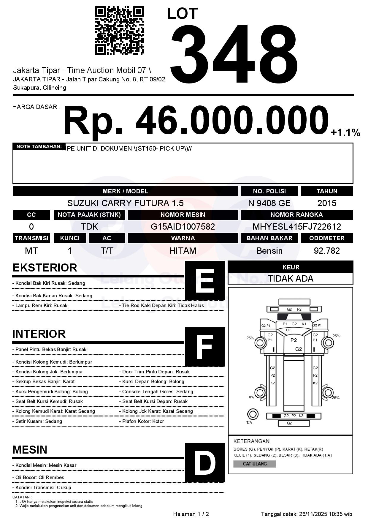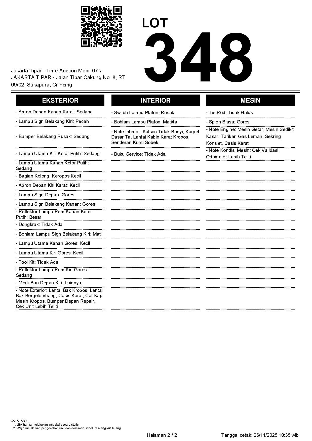 - Kondisi objek lelang dilelang apa adanya, baik kondisi fisik, mesin maupun legalitas kendaraan. Jika terdapat kekurangan/cacat baik yang terlihat maupun yang tidak terlihat, maka semua akan menjadi tanggung jawab/risiko Pemenang Lelang. Oleh karena itu, Pemenang Lelang melepaskan segala hak untuk menuntut dan/atau meminta ganti rugi atas hal tersebut kepada JBA.