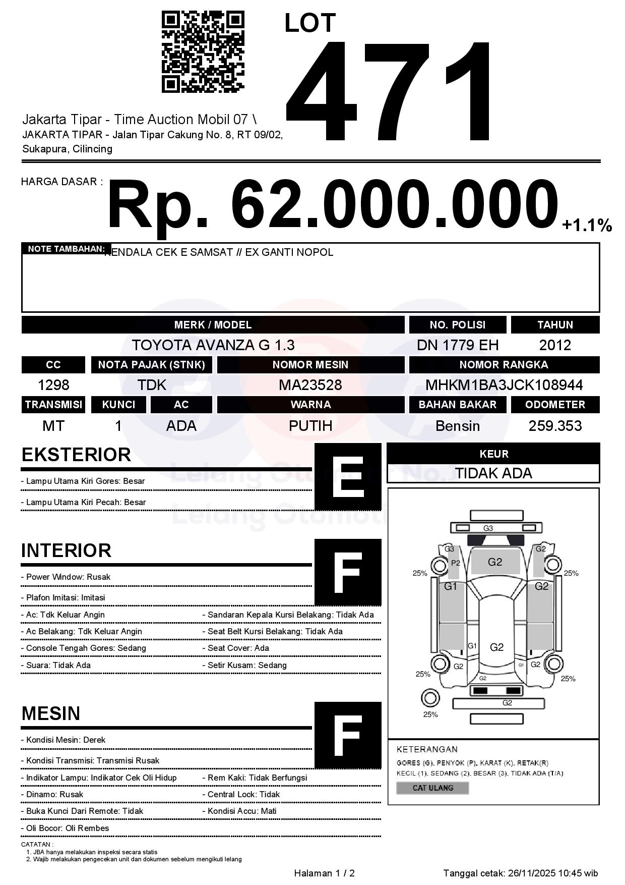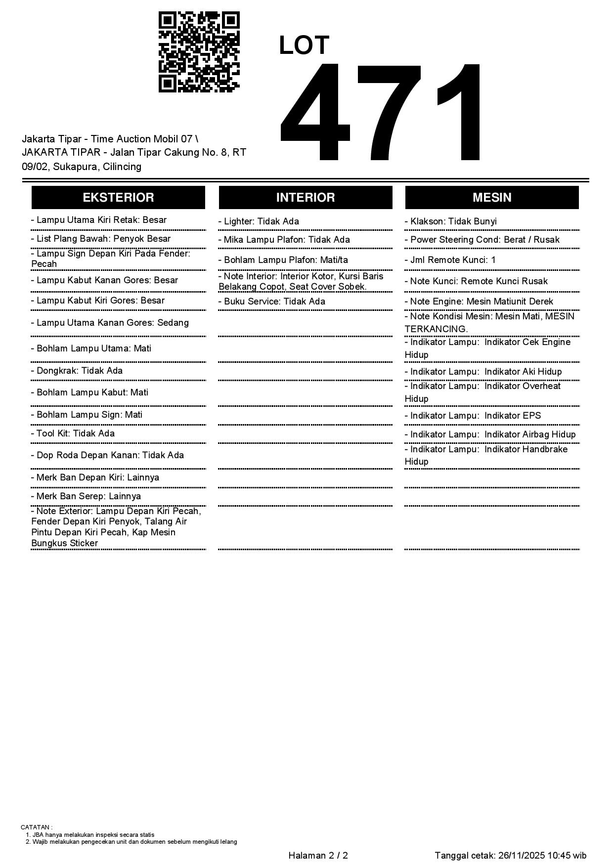 - Kondisi objek lelang dilelang apa adanya, baik kondisi fisik, mesin maupun legalitas kendaraan. Jika terdapat kekurangan/cacat baik yang terlihat maupun yang tidak terlihat, maka semua akan menjadi tanggung jawab/risiko Pemenang Lelang. Oleh karena itu, Pemenang Lelang melepaskan segala hak untuk menuntut dan/atau meminta ganti rugi atas hal tersebut kepada JBA.