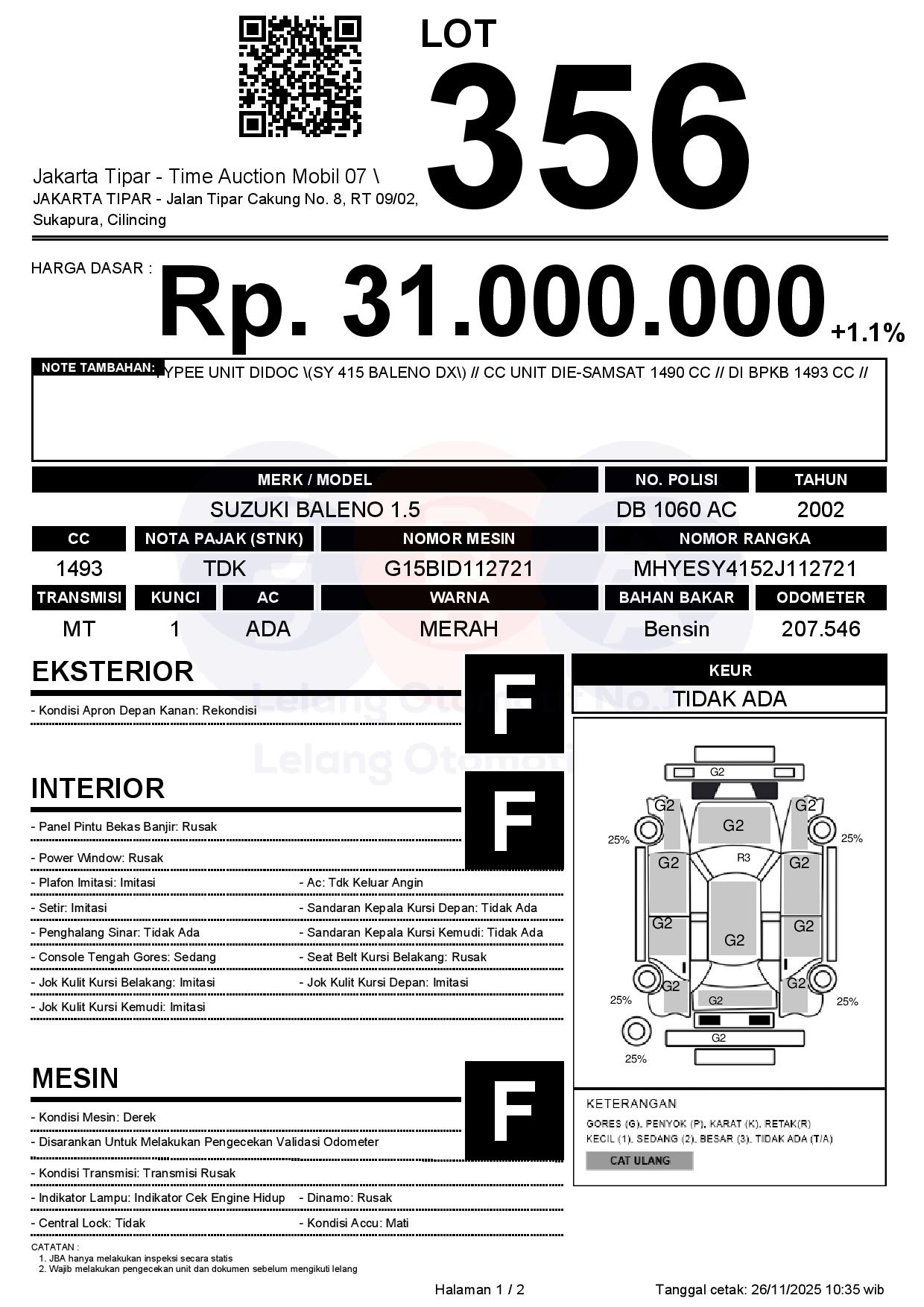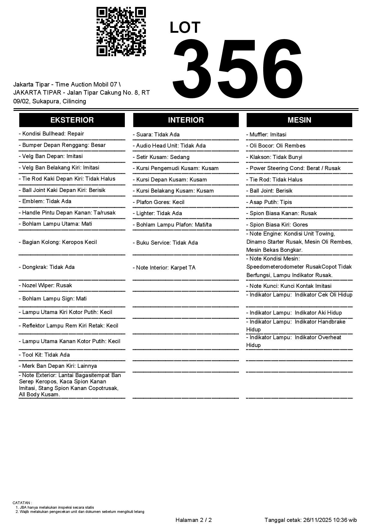 - Kondisi objek lelang dilelang apa adanya, baik kondisi fisik, mesin maupun legalitas kendaraan. Jika terdapat kekurangan/cacat baik yang terlihat maupun yang tidak terlihat, maka semua akan menjadi tanggung jawab/risiko Pemenang Lelang. Oleh karena itu, Pemenang Lelang melepaskan segala hak untuk menuntut dan/atau meminta ganti rugi atas hal tersebut kepada JBA.