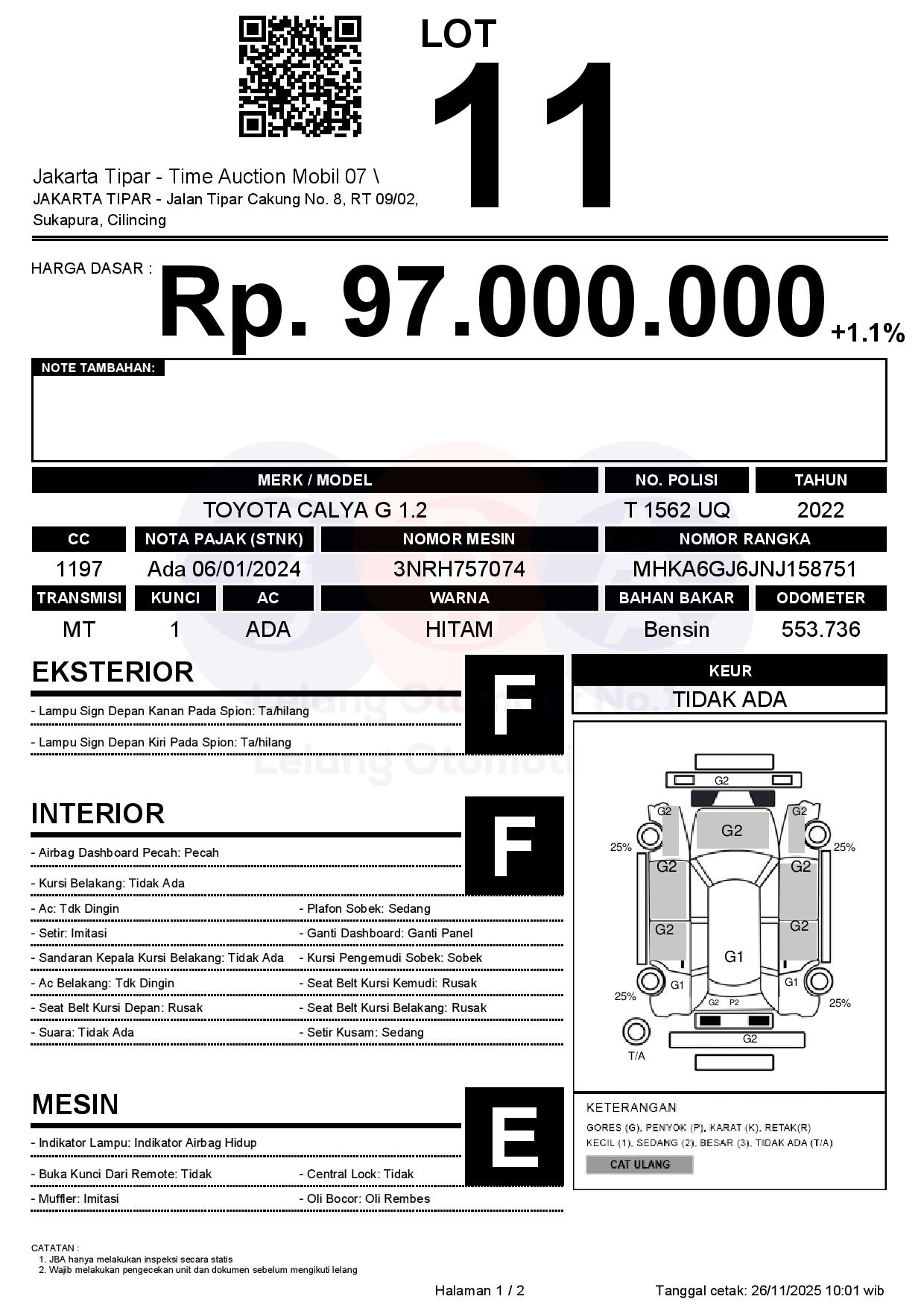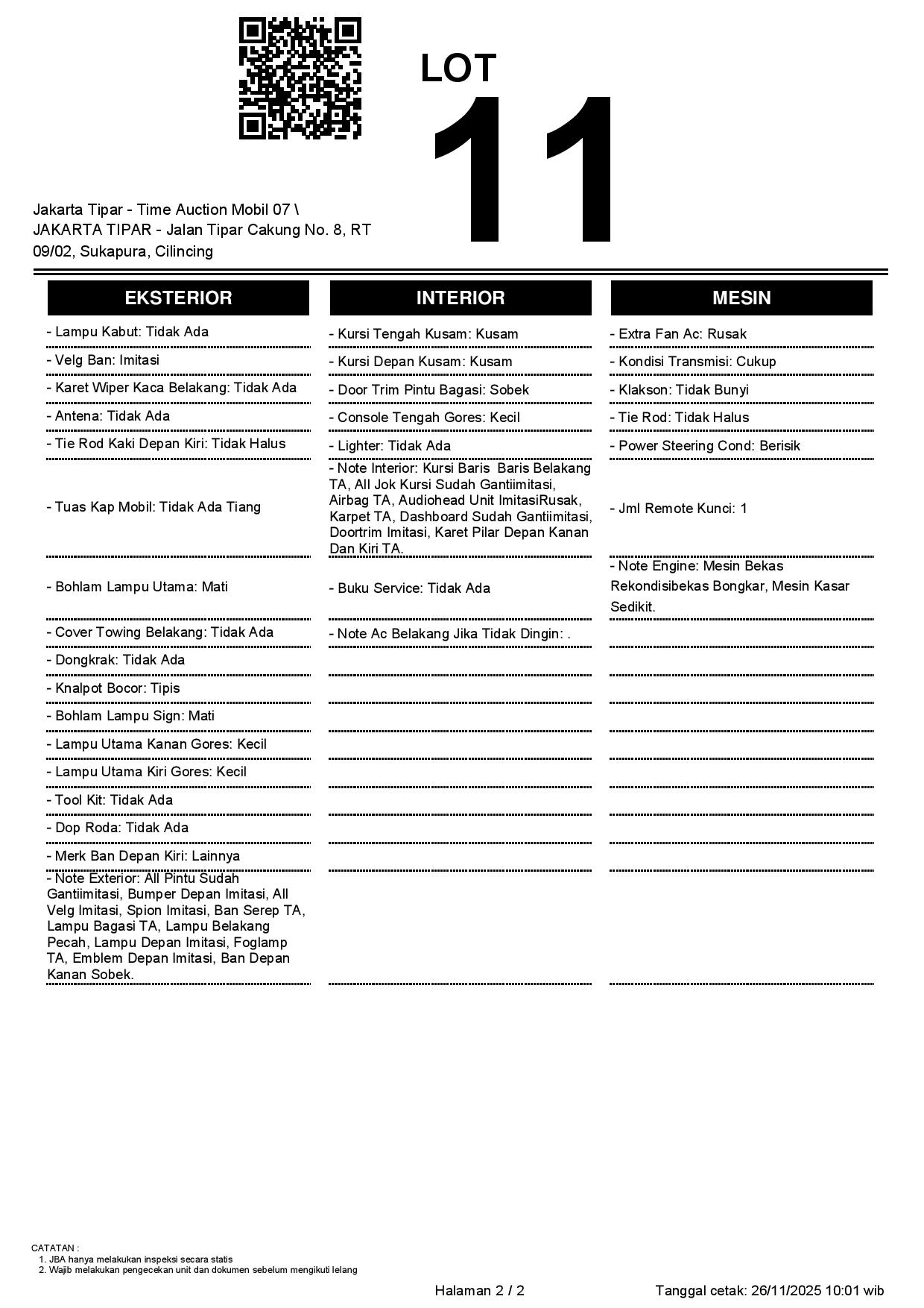 - Kondisi objek lelang dilelang apa adanya, baik kondisi fisik, mesin maupun legalitas kendaraan. Jika terdapat kekurangan/cacat baik yang terlihat maupun yang tidak terlihat, maka semua akan menjadi tanggung jawab/risiko Pemenang Lelang. Oleh karena itu, Pemenang Lelang melepaskan segala hak untuk menuntut dan/atau meminta ganti rugi atas hal tersebut kepada JBA.
