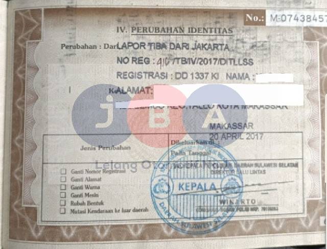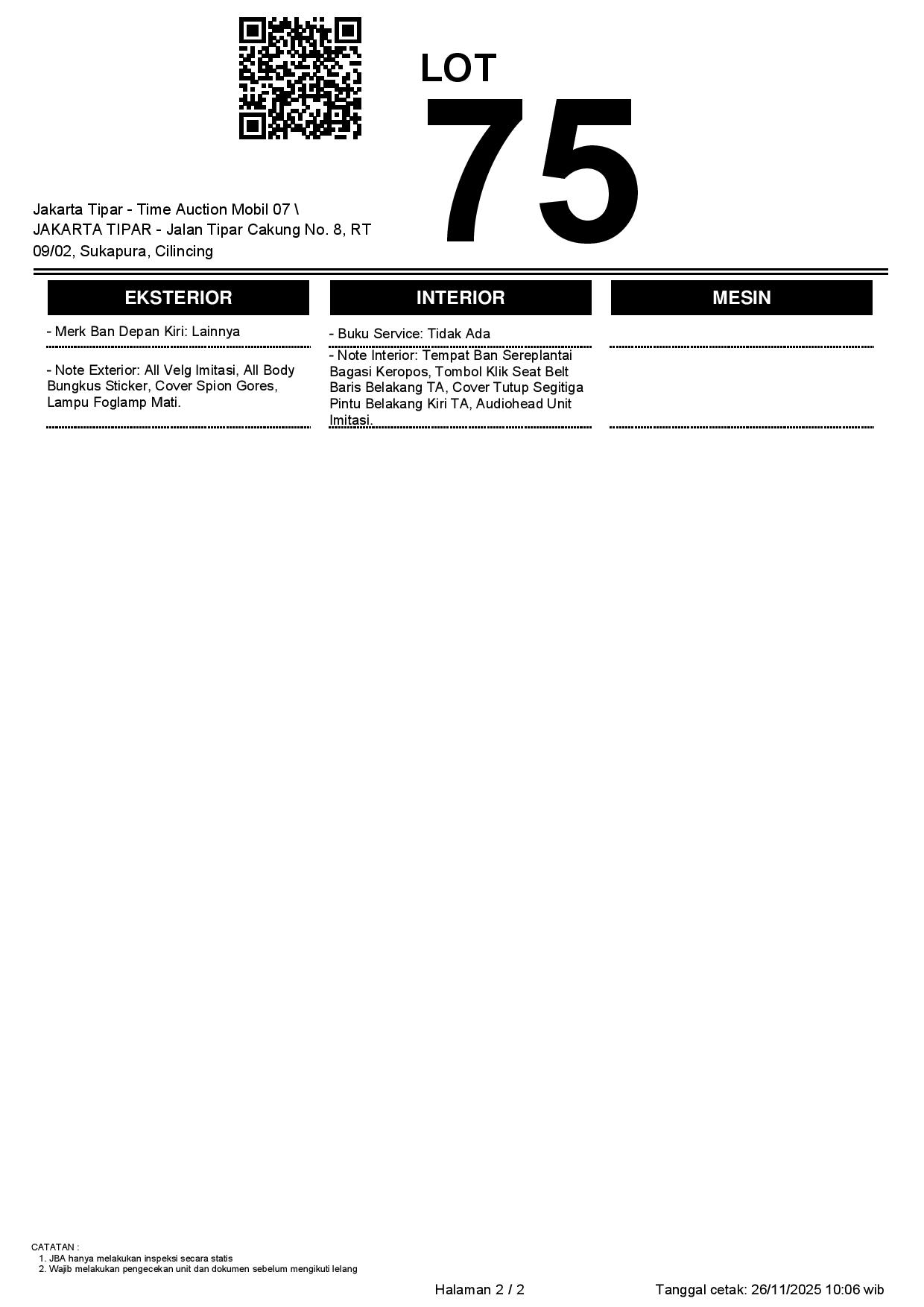 - Kondisi objek lelang dilelang apa adanya, baik kondisi fisik, mesin maupun legalitas kendaraan. Jika terdapat kekurangan/cacat baik yang terlihat maupun yang tidak terlihat, maka semua akan menjadi tanggung jawab/risiko Pemenang Lelang. Oleh karena itu, Pemenang Lelang melepaskan segala hak untuk menuntut dan/atau meminta ganti rugi atas hal tersebut kepada JBA.