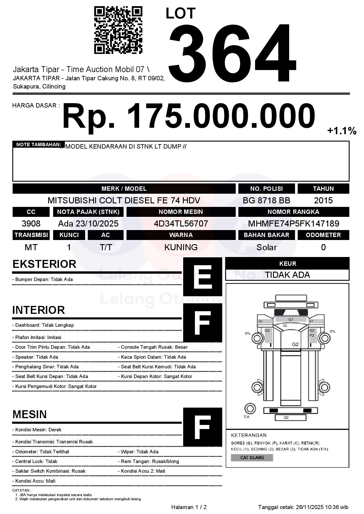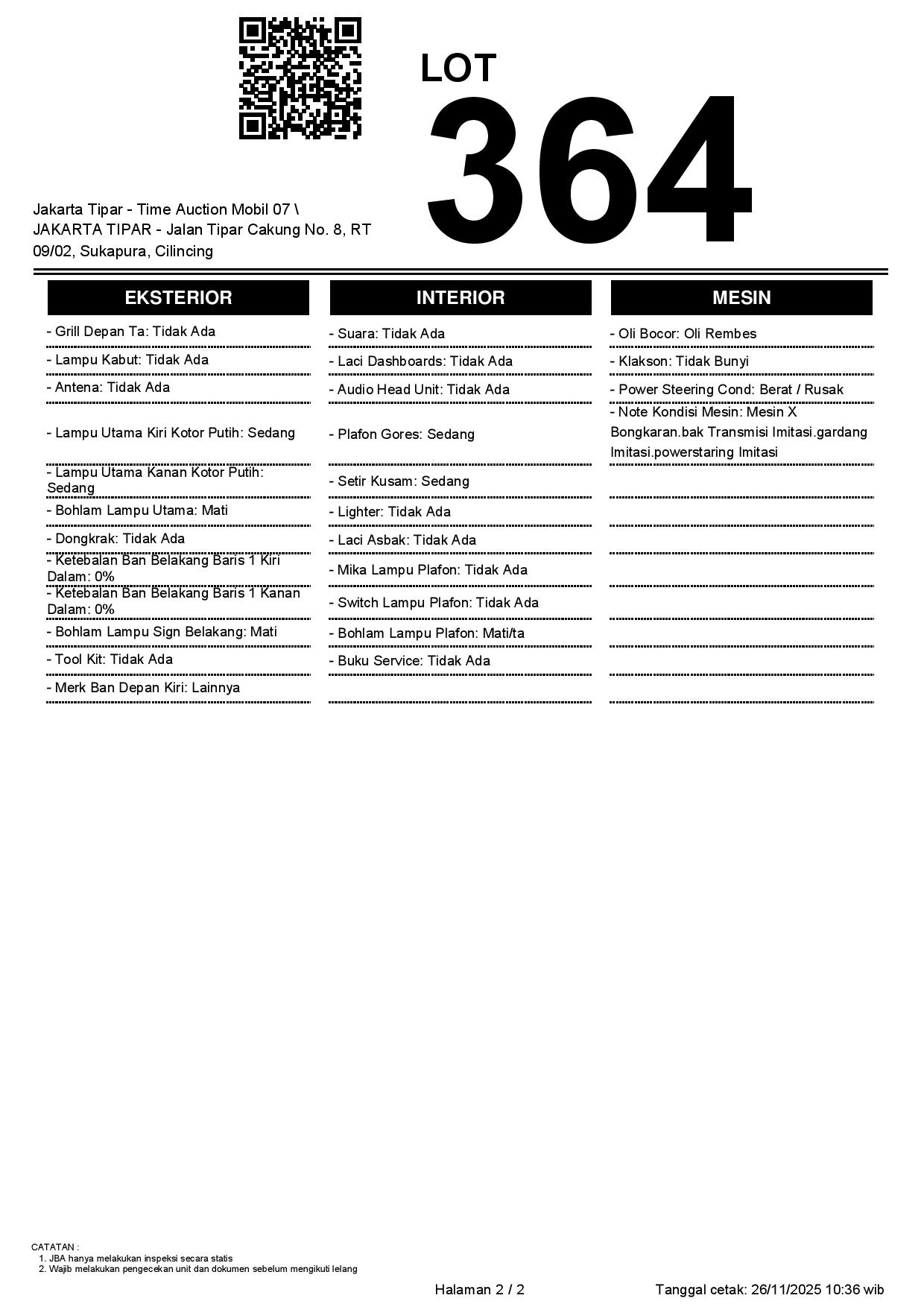 - Kondisi objek lelang dilelang apa adanya, baik kondisi fisik, mesin maupun legalitas kendaraan. Jika terdapat kekurangan/cacat baik yang terlihat maupun yang tidak terlihat, maka semua akan menjadi tanggung jawab/risiko Pemenang Lelang. Oleh karena itu, Pemenang Lelang melepaskan segala hak untuk menuntut dan/atau meminta ganti rugi atas hal tersebut kepada JBA.