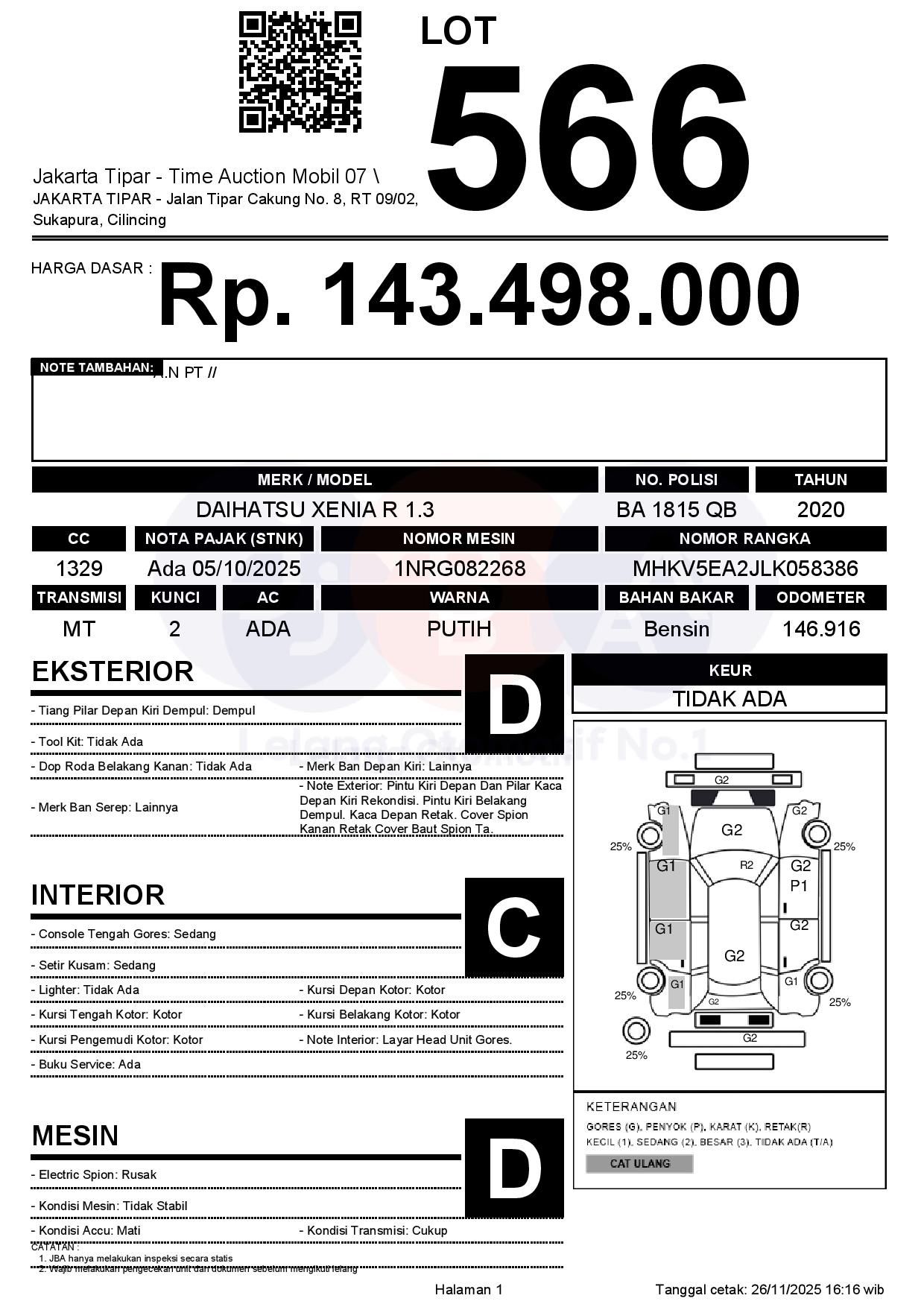 - Kondisi objek lelang dilelang apa adanya, baik kondisi fisik, mesin maupun legalitas kendaraan. Jika terdapat kekurangan/cacat baik yang terlihat maupun yang tidak terlihat, maka semua akan menjadi tanggung jawab/risiko Pemenang Lelang. Oleh karena itu, Pemenang Lelang melepaskan segala hak untuk menuntut dan/atau meminta ganti rugi atas hal tersebut kepada JBA.
