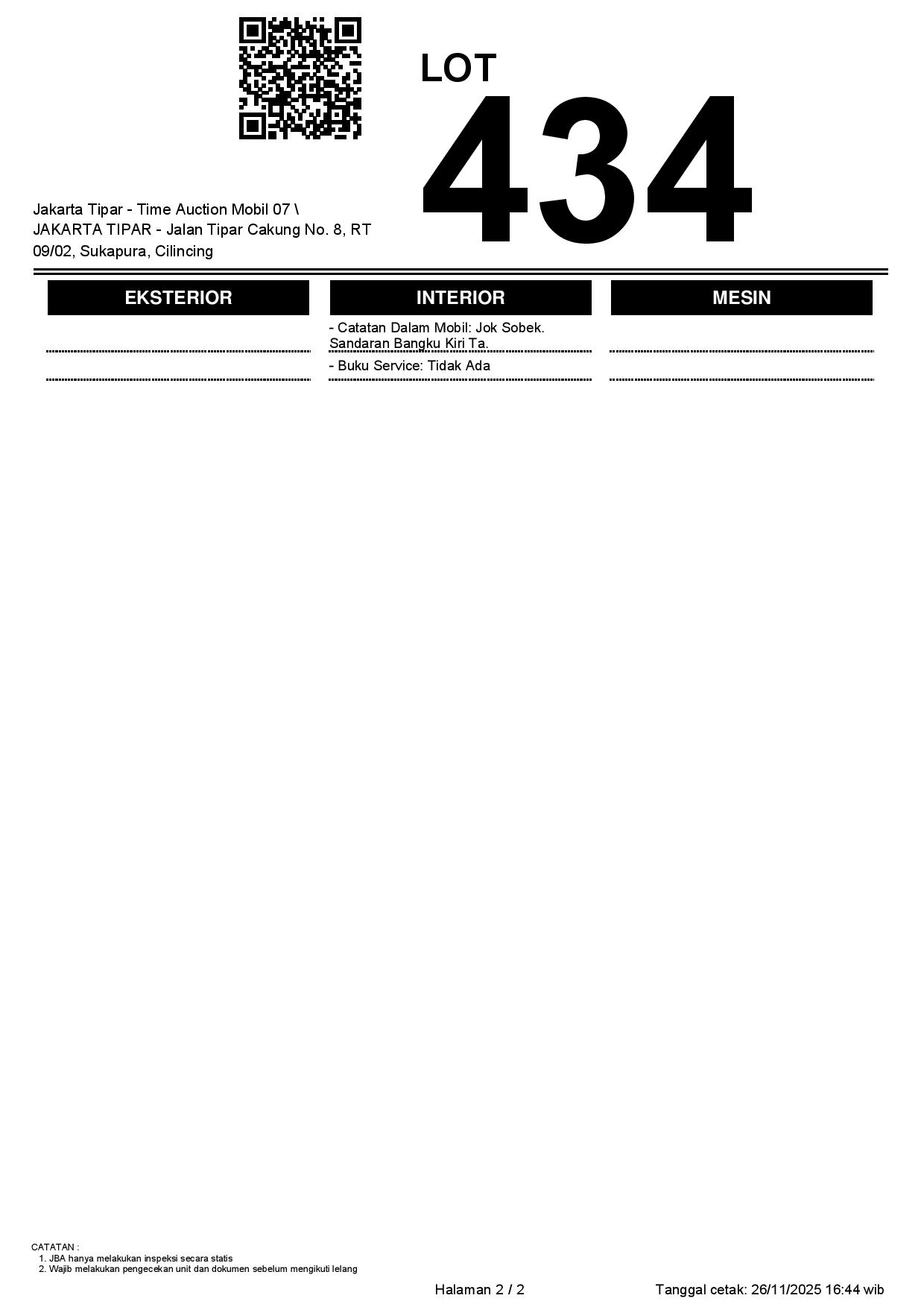 - Kondisi objek lelang dilelang apa adanya, baik kondisi fisik, mesin maupun legalitas kendaraan. Jika terdapat kekurangan/cacat baik yang terlihat maupun yang tidak terlihat, maka semua akan menjadi tanggung jawab/risiko Pemenang Lelang. Oleh karena itu, Pemenang Lelang melepaskan segala hak untuk menuntut dan/atau meminta ganti rugi atas hal tersebut kepada JBA.