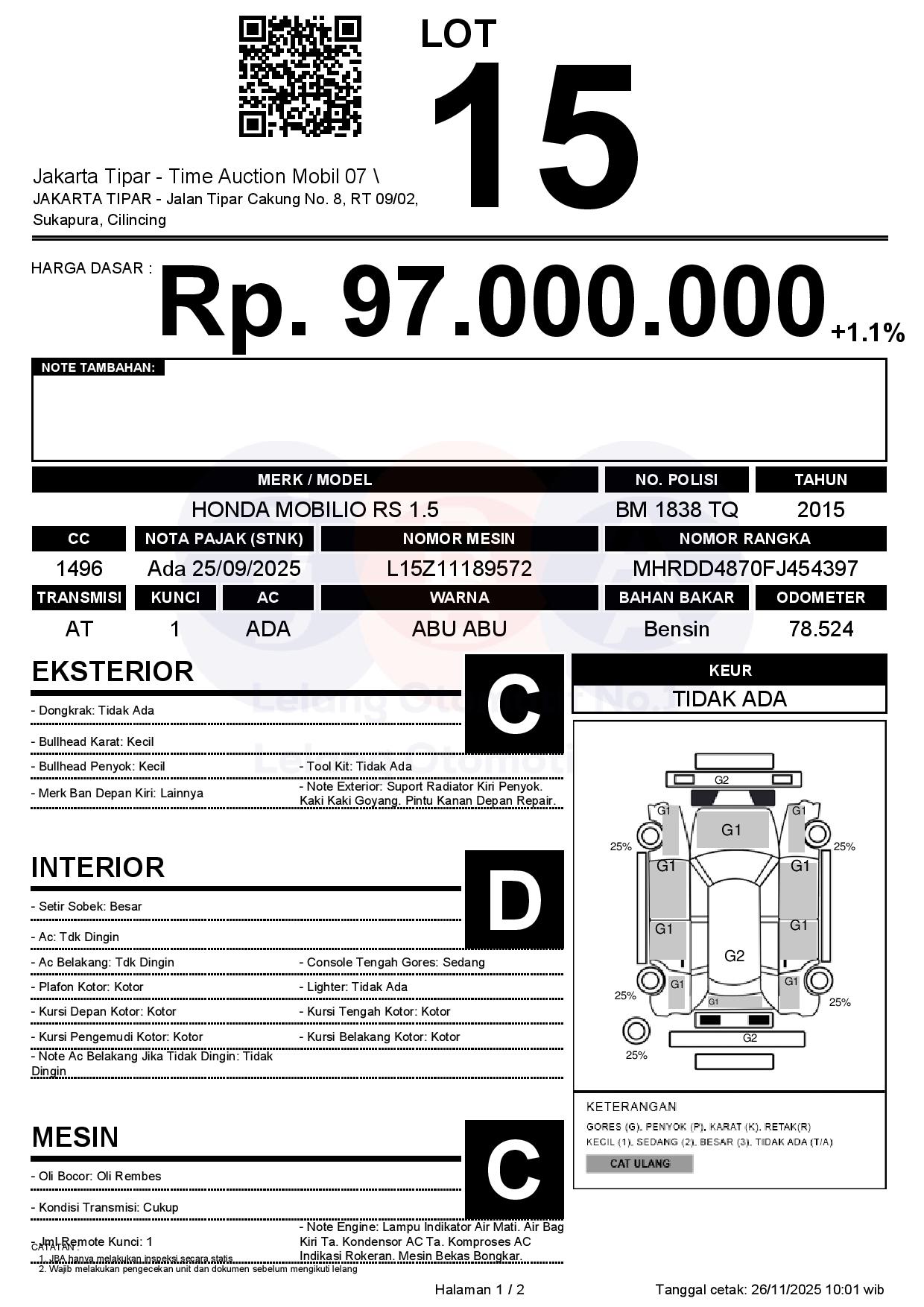 - Kondisi objek lelang dilelang apa adanya, baik kondisi fisik, mesin maupun legalitas kendaraan. Jika terdapat kekurangan/cacat baik yang terlihat maupun yang tidak terlihat, maka semua akan menjadi tanggung jawab/risiko Pemenang Lelang. Oleh karena itu, Pemenang Lelang melepaskan segala hak untuk menuntut dan/atau meminta ganti rugi atas hal tersebut kepada JBA.