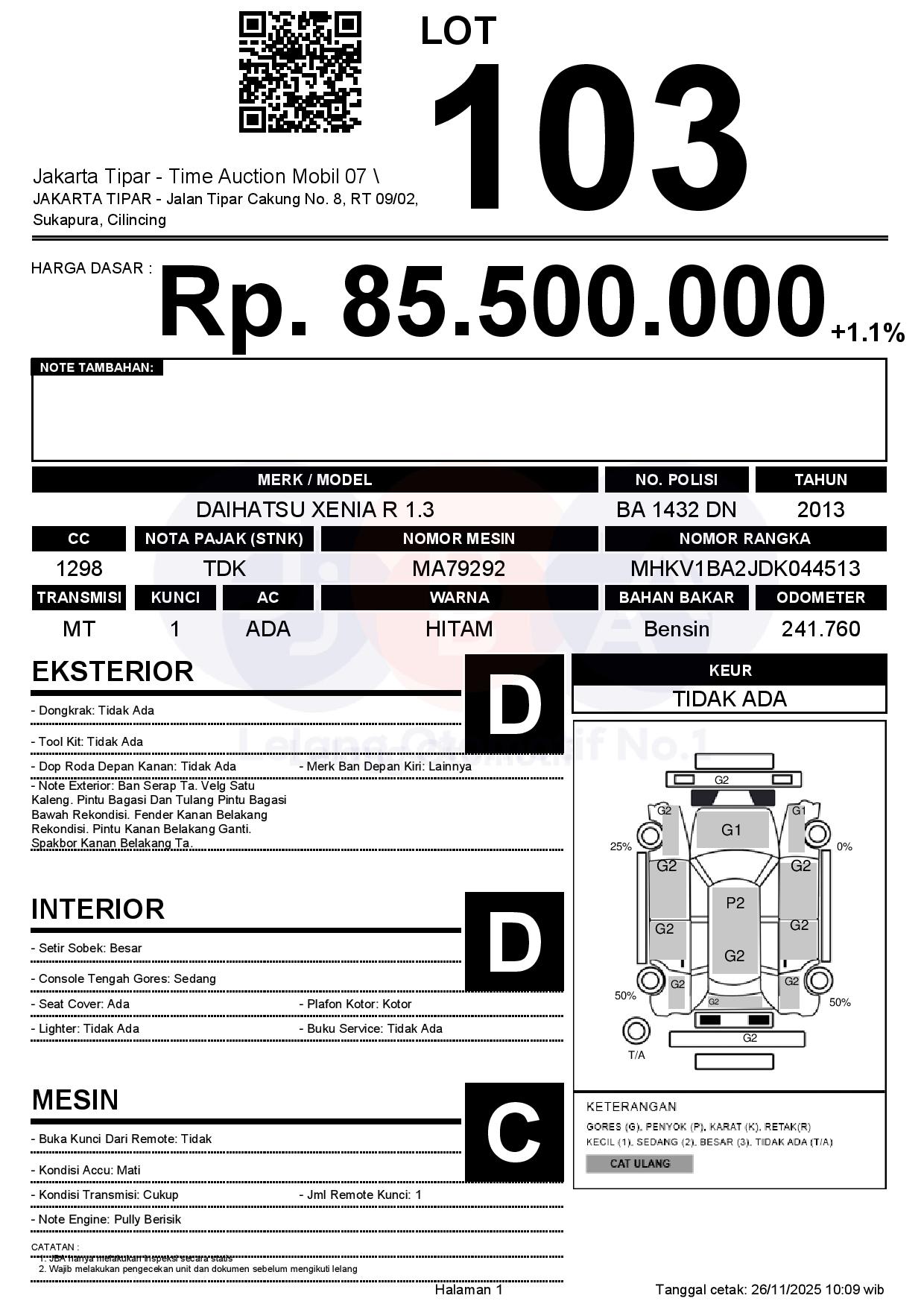- Kondisi objek lelang dilelang apa adanya, baik kondisi fisik, mesin maupun legalitas kendaraan. Jika terdapat kekurangan/cacat baik yang terlihat maupun yang tidak terlihat, maka semua akan menjadi tanggung jawab/risiko Pemenang Lelang. Oleh karena itu, Pemenang Lelang melepaskan segala hak untuk menuntut dan/atau meminta ganti rugi atas hal tersebut kepada JBA.