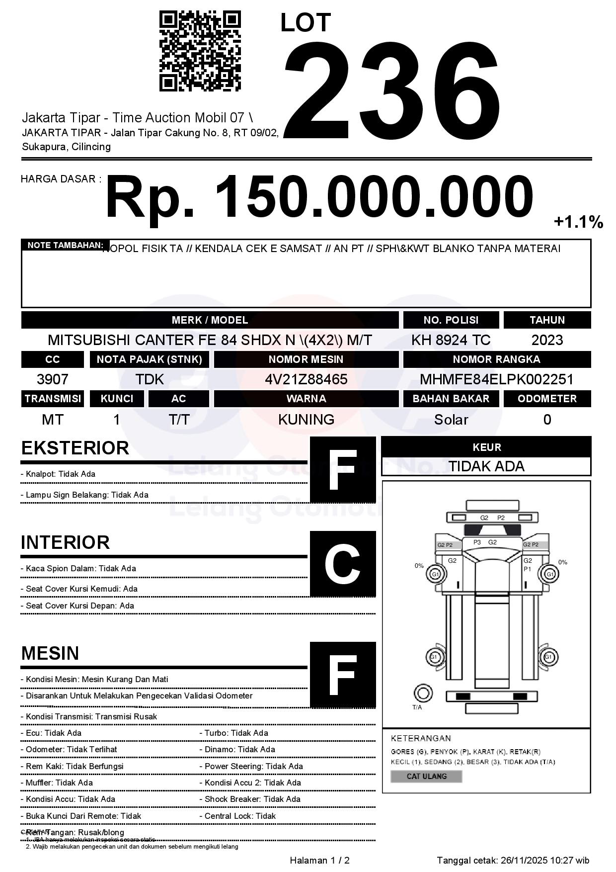 - Pemenang Lelang wajib membayar biaya administrasi lelang sebesar 0,6 % (nol koma enam persen) per unit dari harga terbentuk.