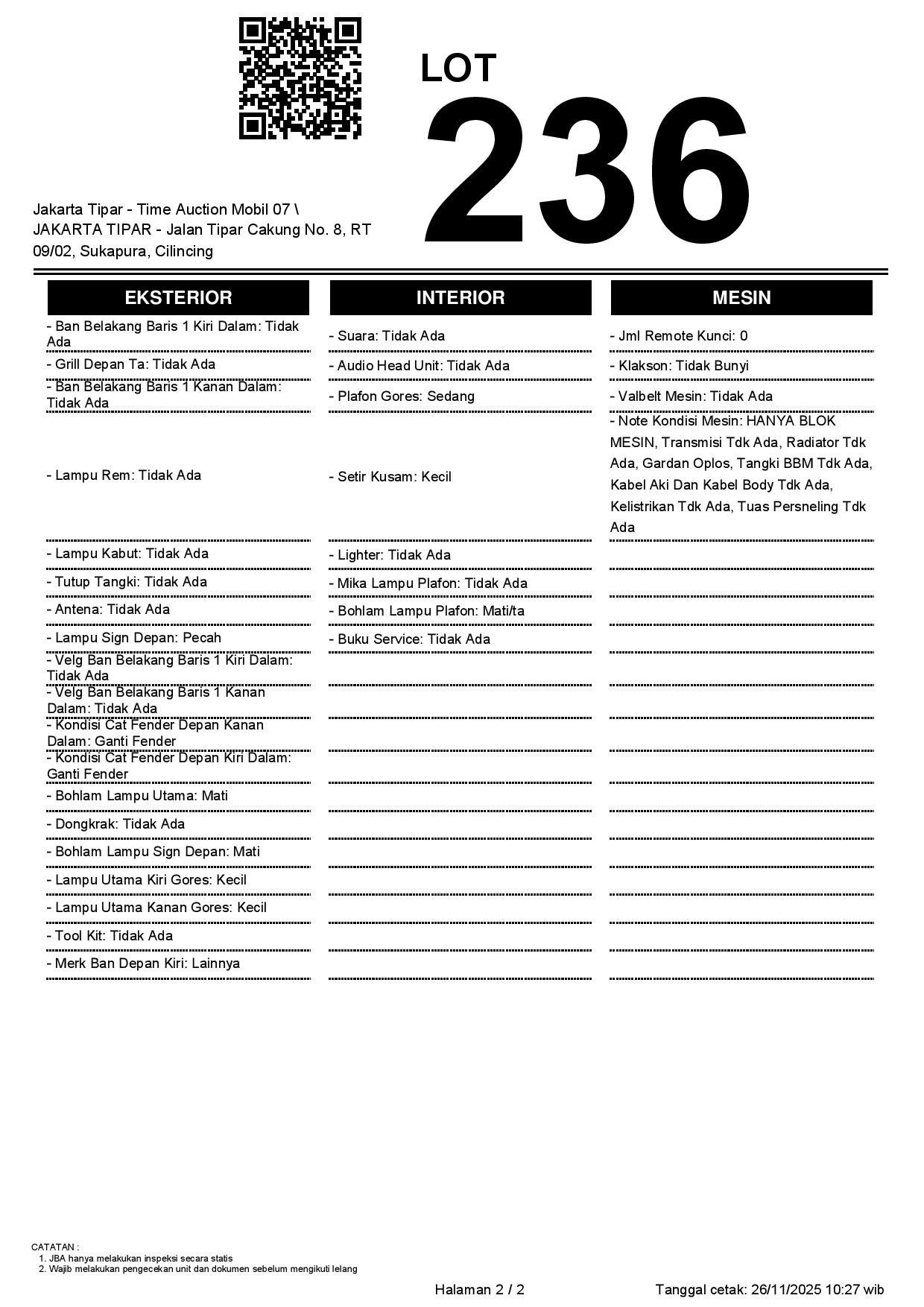 - Kondisi objek lelang dilelang apa adanya, baik kondisi fisik, mesin maupun legalitas kendaraan. Jika terdapat kekurangan/cacat baik yang terlihat maupun yang tidak terlihat, maka semua akan menjadi tanggung jawab/risiko Pemenang Lelang. Oleh karena itu, Pemenang Lelang melepaskan segala hak untuk menuntut dan/atau meminta ganti rugi atas hal tersebut kepada JBA.