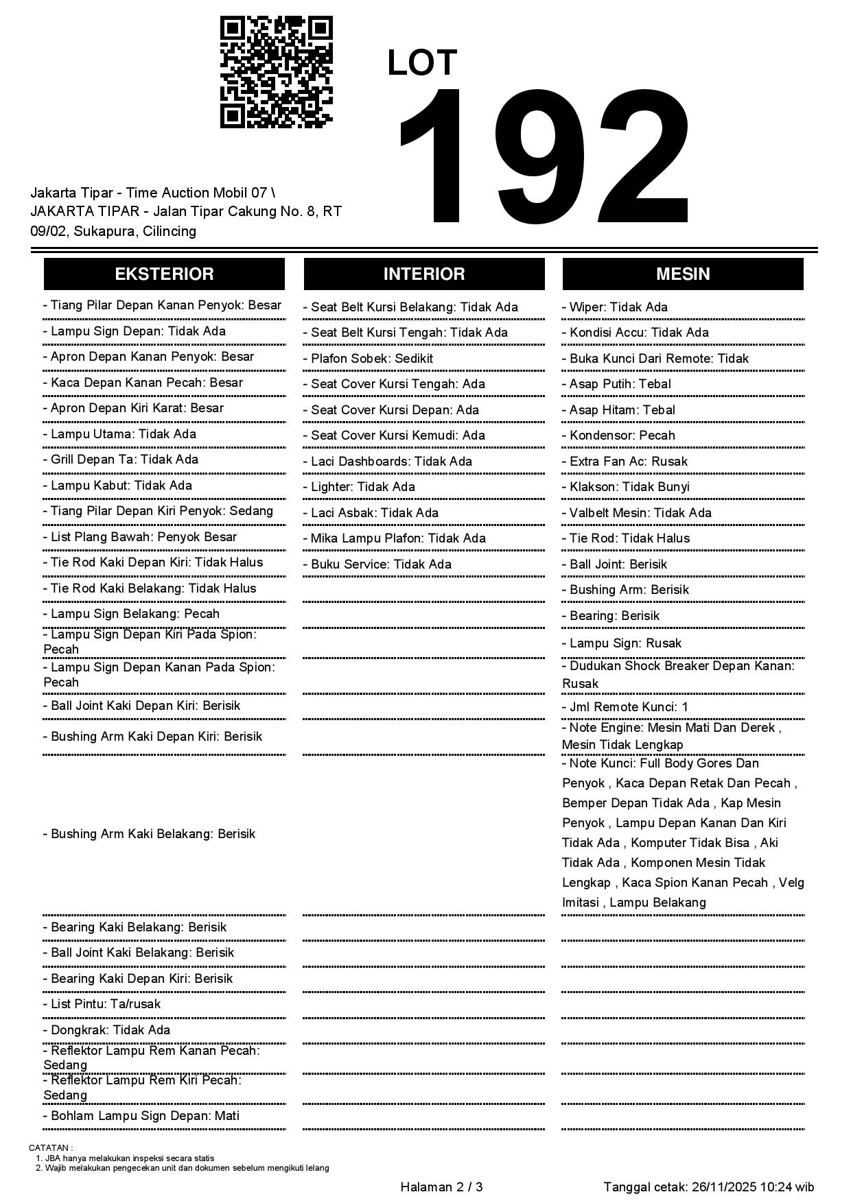 - Kondisi objek lelang dilelang apa adanya, baik kondisi fisik, mesin maupun legalitas kendaraan. Jika terdapat kekurangan/cacat baik yang terlihat maupun yang tidak terlihat, maka semua akan menjadi tanggung jawab/risiko Pemenang Lelang. Oleh karena itu, Pemenang Lelang melepaskan segala hak untuk menuntut dan/atau meminta ganti rugi atas hal tersebut kepada JBA.